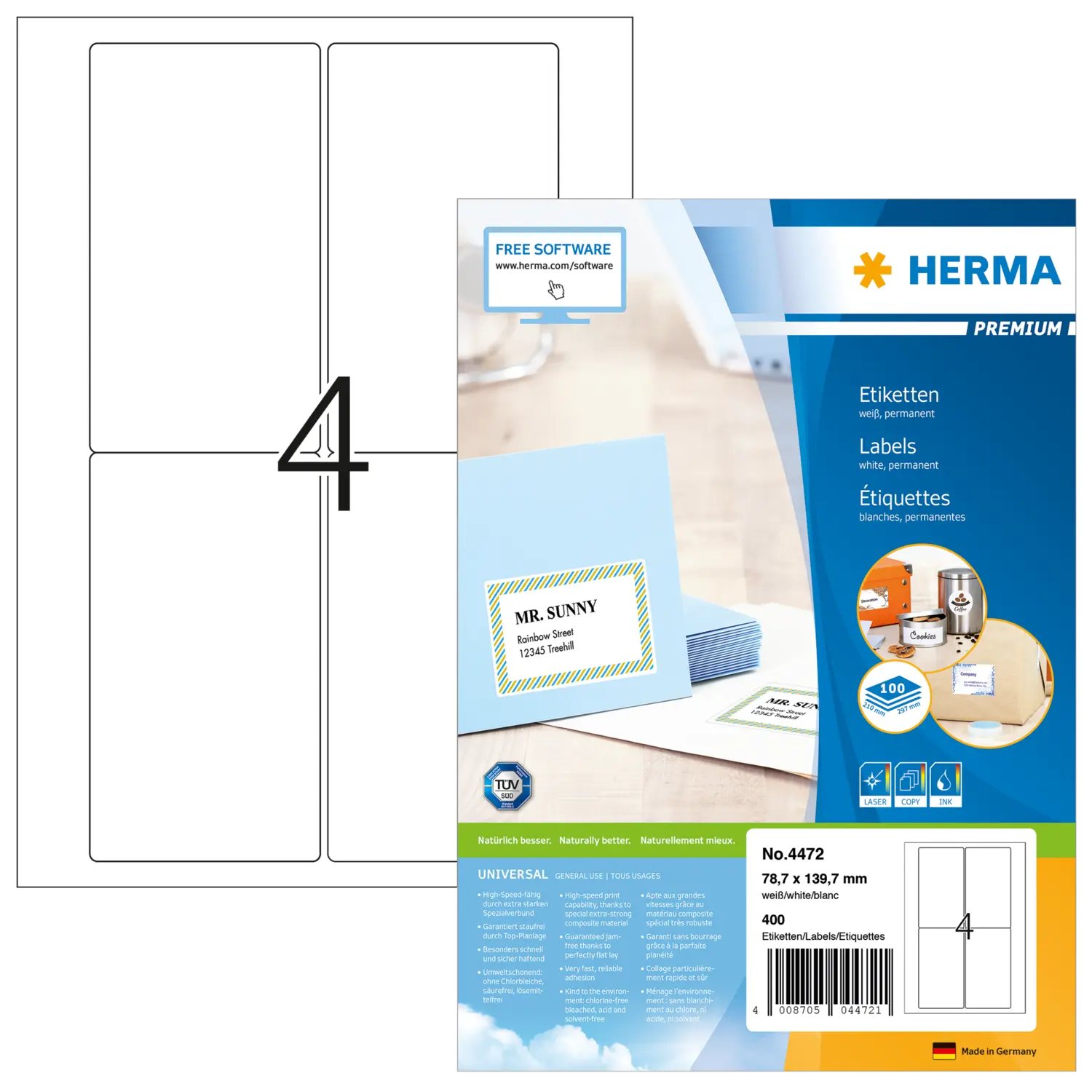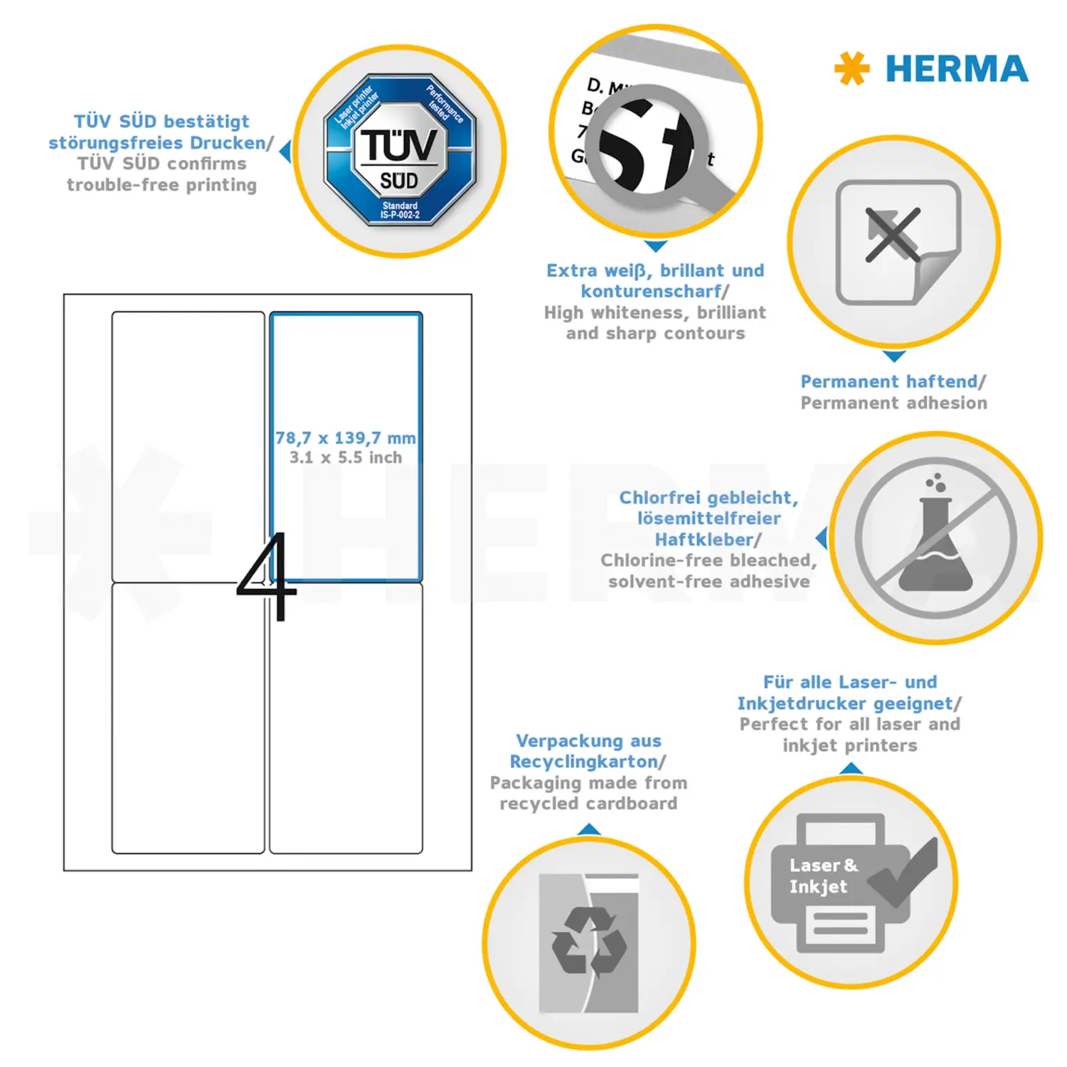 Selbstklebende Etiketten auf A4-Blättern, permanent haftend. Perfekt für alle Laser- und Inkjetdrucker, Kopierer, Farblaserdrucker und Farbkopierer. Garantiert staufrei und high-speed-fähig durch extra starken Spezialverbund, Top-Planlage und Rundum-Sicherheitskante. Problemloser Druckerdurchlauf für Laserdrucker und Inkjetdrucker getestet und bestätigt durch den TÜV SÜD. Hoher Weißegrad und gleichmäßige Oberfläche für beste Druckergebnisse in Schwarz und Farbe. Spürbar dicker: extra starke Etiketten, einfaches Aufkleben. Besonders schnell und sicher haftend, auch auf kühlen und feuchten Oberflächen. Umweltschonend und nachhaltig: chlorfrei gebleicht, FSC® Mix Credit-zertifiziert, lösemittelfreier Haftkleber. Etikettenmaterial recyclingfähig mit dem Altpapier, Trägerpapier mit dem Restmüll entsorgen, Verpackung aus Recyclingkarton. Kostenlose Softwarelösungen: www.herma.de/software.