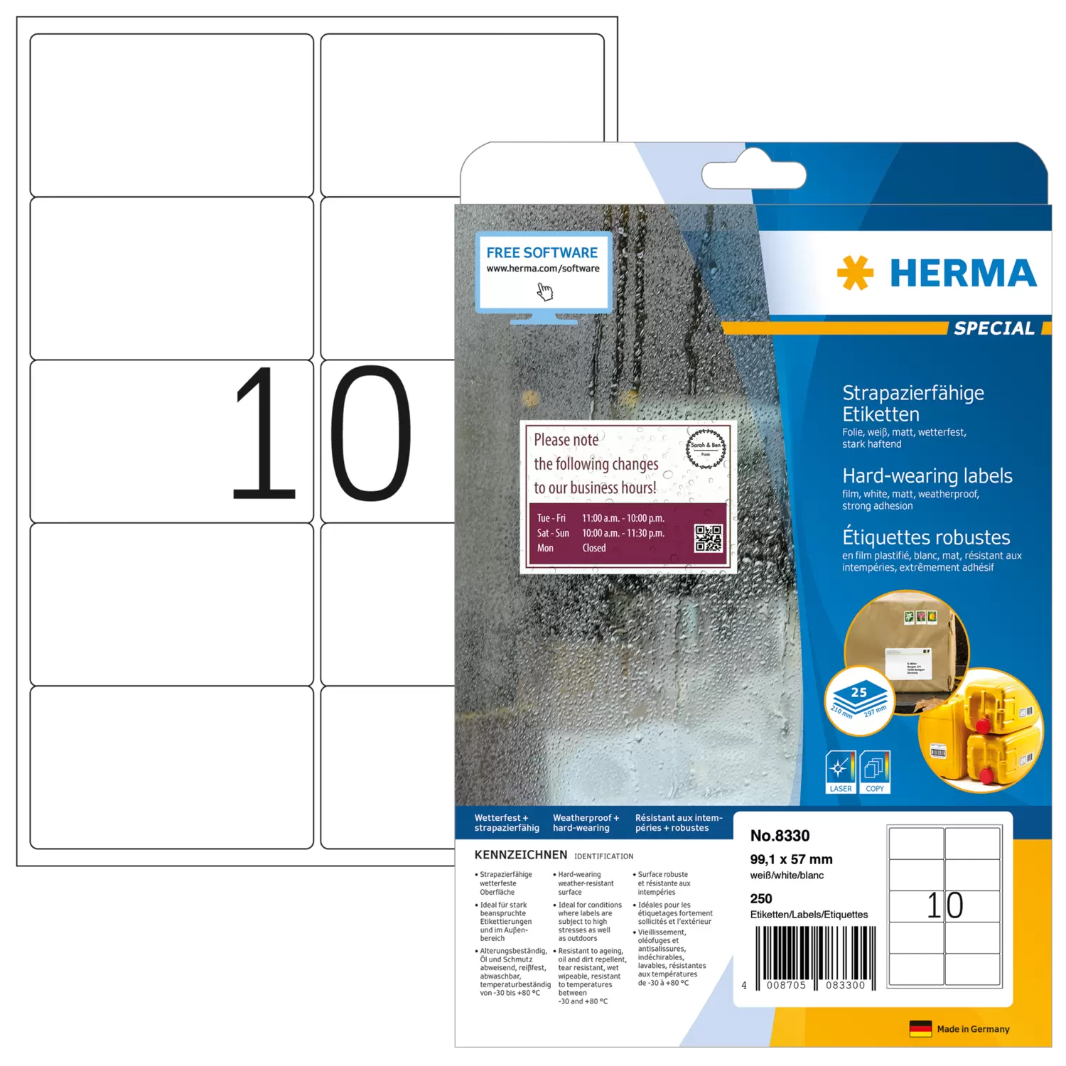 Versandetiketten aus weißer Polyesterfolie, auf A4-Blättern, selbstklebend. Robust und strapazierfähig - bei jedem Wetter lesbar. Sicher haftend auf allen Verpackungsmaterialien: Kuverts, Pakete, Versandrollen, Folien, PE und Tyvek. Strapazierfähige wetterfeste Oberfläche, besonders stark haftend, Schmutz abweisend, reißfest, temperaturbeständig, seewasserfest. Störungsfreie Verarbeitung durch Rundum-Sicherheitskante und optimale Planlage. Für Laserdrucker und Kopierer, Farblaserdrucker und Farbkopierer. Nicht für Inkjetdrucker geeignet. Kostenlose Softwarelösungen: www.herma.de/software.