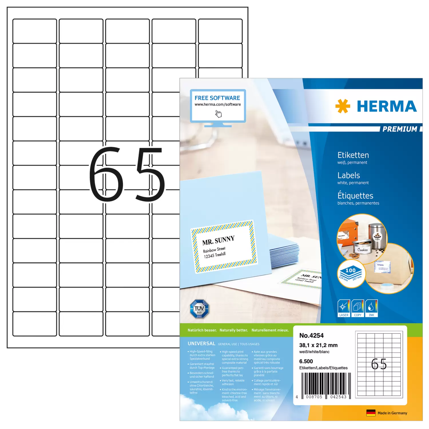 Selbstklebende Etiketten auf A4-Blättern, permanent haftend. Perfekt für alle Laser- und Inkjetdrucker, Kopierer, Farblaserdrucker und Farbkopierer. Garantiert staufrei und high-speed-fähig durch extra starken Spezialverbund, Top-Planlage und Rundum-Sicherheitskante. Problemloser Druckerdurchlauf für Laserdrucker und Inkjetdrucker getestet und bestätigt durch den TÜV SÜD. Hoher Weißegrad und gleichmäßige Oberfläche für beste Druckergebnisse in Schwarz und Farbe. Spürbar dicker: extra starke Etiketten, einfaches Aufkleben. Besonders schnell und sicher haftend, auch auf kühlen und feuchten Oberflächen. Umweltschonend und nachhaltig: chlorfrei gebleicht, FSC® Mix Credit-zertifiziert, lösemittelfreier Haftkleber. Etikettenmaterial recyclingfähig mit dem Altpapier, Trägerpapier mit dem Restmüll entsorgen, Verpackung aus Recyclingkarton. Kostenlose Softwarelösungen: www.herma.de/software.