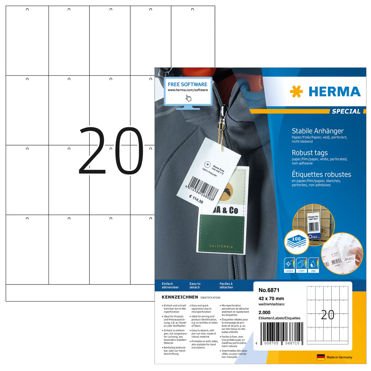 - Einfach und schnell trennbar durch Mikroperforation, mit vorgestanzter Lochung, einfache Befestigung mit Faden oder Splinte
