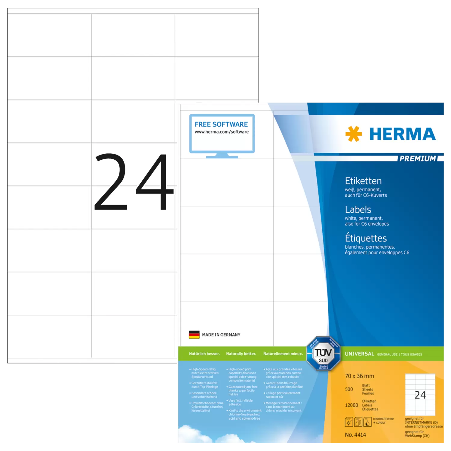 Selbstklebende Etiketten auf A4-Blättern, permanent haftend. Perfekt für alle Laser- und Inkjetdrucker, Kopierer, Farblaserdrucker und Farbkopierer. Garantiert staufrei und high-speed-fähig durch extra starken Spezialverbund, Top-Planlage und Rundum-Sicherheitskante. Problemloser Druckerdurchlauf für Laserdrucker und Inkjetdrucker getestet und bestätigt durch den TÜV SÜD. Hoher Weißegrad und gleichmäßige Oberfläche für beste Druckergebnisse in Schwarz und Farbe. Spürbar dicker: extra starke Etiketten, einfaches Aufkleben. Besonders schnell und sicher haftend, auch auf kühlen und feuchten Oberflächen. Umweltschonend und nachhaltig: chlorfrei gebleicht, FSC® Mix Credit-zertifiziert, lösemittelfreier Haftkleber. Etikettenmaterial recyclingfähig mit dem Altpapier, Trägerpapier mit dem Restmüll entsorgen, Verpackung aus Recyclingkarton. Kostenlose Softwarelösungen: www.herma.de/software.