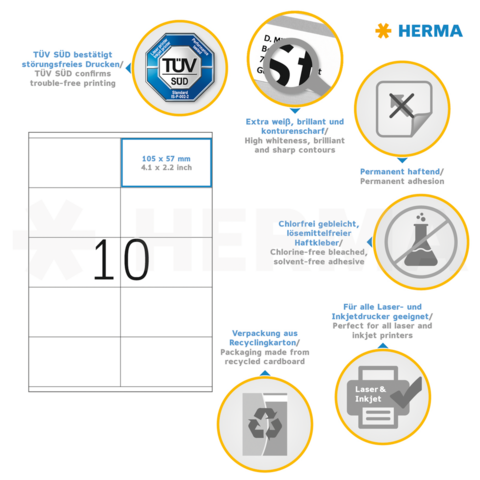 Selbstklebende Etiketten auf A4-Blättern, permanent haftend. Perfekt für alle Laser- und Inkjetdrucker, Kopierer, Farblaserdrucker und Farbkopierer. Garantiert staufrei und high-speed-fähig durch extra starken Spezialverbund, Top-Planlage und Rundum-Sicherheitskante. Problemloser Druckerdurchlauf für Laserdrucker und Inkjetdrucker getestet und bestätigt durch den TÜV SÜD. Hoher Weißegrad und gleichmäßige Oberfläche für beste Druckergebnisse in Schwarz und Farbe. Spürbar dicker: extra starke Etiketten, einfaches Aufkleben. Besonders schnell und sicher haftend, auch auf kühlen und feuchten Oberflächen. Umweltschonend und nachhaltig: chlorfrei gebleicht, FSC® Mix Credit-zertifiziert, lösemittelfreier Haftkleber. Etikettenmaterial recyclingfähig mit dem Altpapier, Trägerpapier mit dem Restmüll entsorgen, Verpackung aus Recyclingkarton. Kostenlose Softwarelösungen: www.herma.de/software.