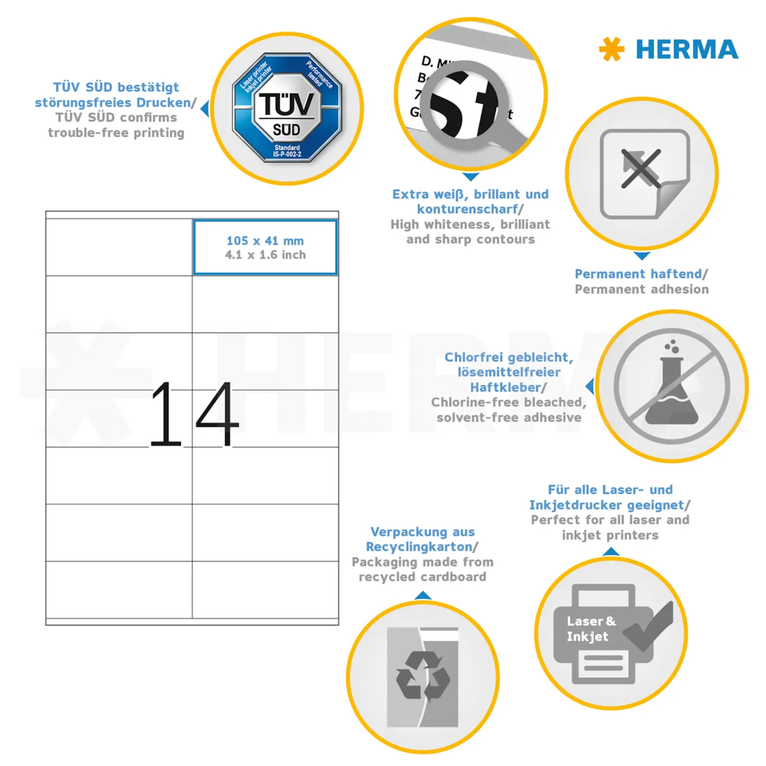 Selbstklebende Etiketten auf A4-Blättern, permanent haftend. Perfekt für alle Laser- und Inkjetdrucker, Kopierer, Farblaserdrucker und Farbkopierer. Garantiert staufrei und high-speed-fähig durch extra starken Spezialverbund, Top-Planlage und Rundum-Sicherheitskante. Problemloser Druckerdurchlauf für Laserdrucker und Inkjetdrucker getestet und bestätigt durch den TÜV SÜD. Hoher Weißegrad und gleichmäßige Oberfläche für beste Druckergebnisse in Schwarz und Farbe. Spürbar dicker: extra starke Etiketten, einfaches Aufkleben. Besonders schnell und sicher haftend, auch auf kühlen und feuchten Oberflächen. Umweltschonend und nachhaltig: chlorfrei gebleicht, FSC® Mix Credit-zertifiziert, lösemittelfreier Haftkleber. Etikettenmaterial recyclingfähig mit dem Altpapier, Trägerpapier mit dem Restmüll entsorgen, Verpackung aus Recyclingkarton. Kostenlose Softwarelösungen: www.herma.de/software.