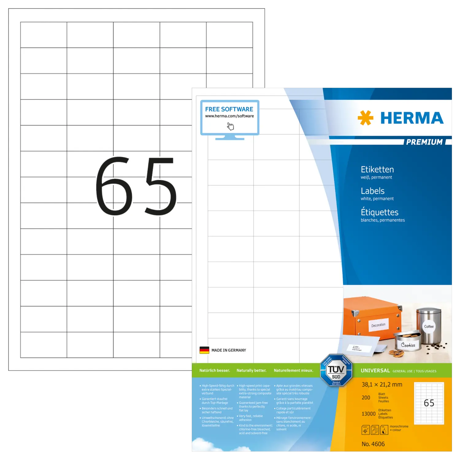 Selbstklebende Etiketten auf A4-Blättern, permanent haftend. Perfekt für alle Laser- und Inkjetdrucker, Kopierer, Farblaserdrucker und Farbkopierer. Garantiert staufrei und high-speed-fähig durch extra starken Spezialverbund, Top-Planlage und Rundum-Sicherheitskante. Problemloser Druckerdurchlauf für Laserdrucker und Inkjetdrucker getestet und bestätigt durch den TÜV SÜD. Hoher Weißegrad und gleichmäßige Oberfläche für beste Druckergebnisse in Schwarz und Farbe. Spürbar dicker: extra starke Etiketten, einfaches Aufkleben. Besonders schnell und sicher haftend, auch auf kühlen und feuchten Oberflächen. Umweltschonend und nachhaltig: chlorfrei gebleicht, FSC® Mix Credit-zertifiziert, lösemittelfreier Haftkleber. Etikettenmaterial recyclingfähig mit dem Altpapier, Trägerpapier mit dem Restmüll entsorgen, Verpackung aus Recyclingkarton. Kostenlose Softwarelösungen: www.herma.de/software.