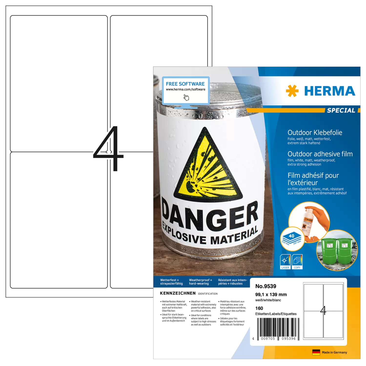 Wetterfeste Etiketten aus weißer, matter Polyethylen-Folie, selbstklebend. Ideal für Outdoor-Anwendungen und stark beanspruchte Etikettierungen: Eigentumsetiketten, Schaufensteraufkleber, Hinweis- und Warnschilder, Kennzeichnungen in Lager und Produktion. Extrem stark haftend, auch auf kritischen Oberflächen. Wetterfest, dehnfähig, alterungsbeständig, Öl und Schmutz abweisend, abwaschbar, temperaturbeständig von -40 bis +150 °C, seewasserbeständig. Für Laserdrucker, Kopierer, Farblaserdrucker und Farbkopierer. Kostenlose Softwarelösungen: www.herma.de/software.