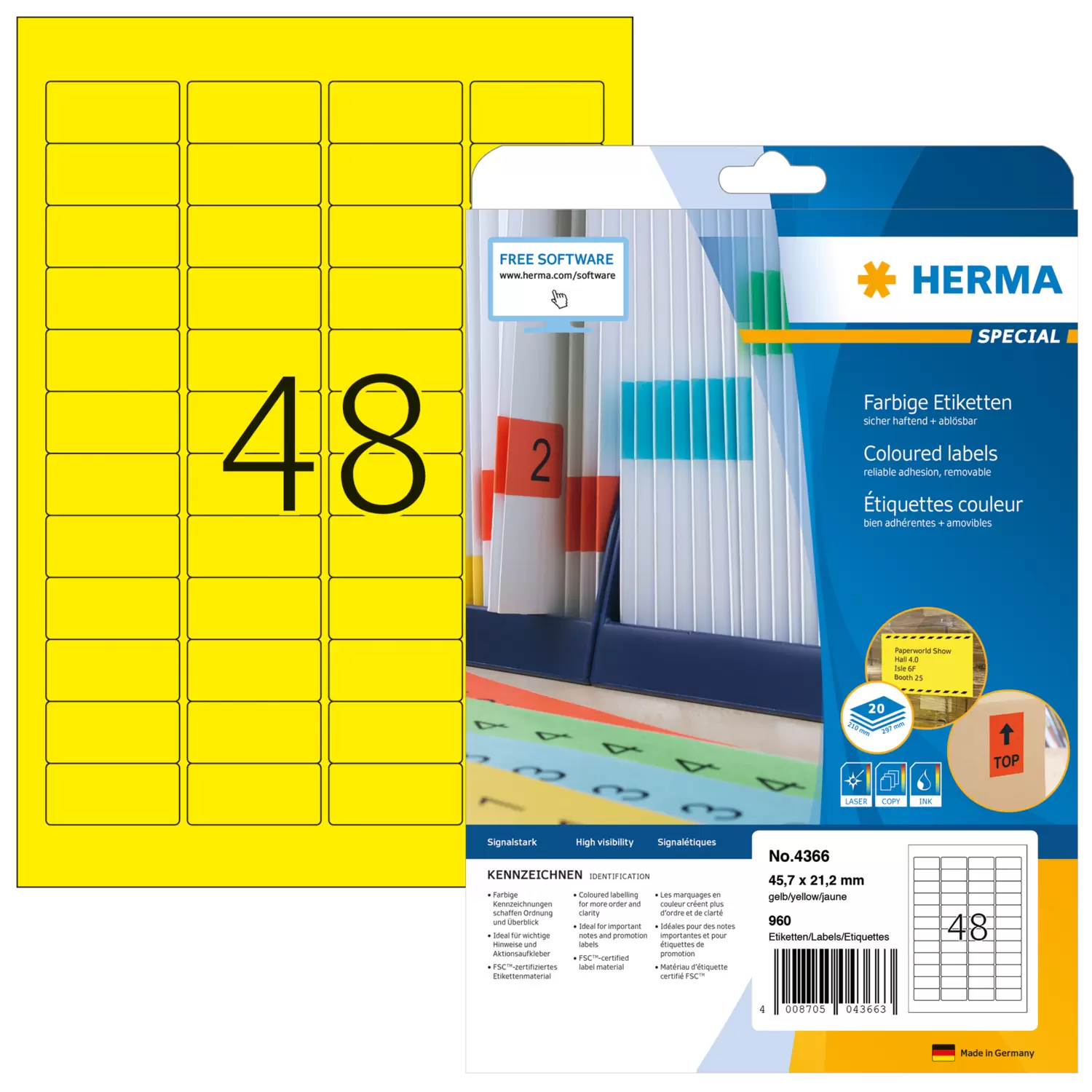 Farbige Etiketten auf A4-Blättern, selbstklebend. Ideal für Kennzeichnungen mit Signalcharakter, z. B. Warnhinweise, Eilvermerke, Adressänderungen, Farbcodierung, Aktionen,... Umweltfreundlich: FSC® Mix Credit-zertifiziertes Etikettenpapier, chlorfrei gebleicht, lösemittelfreier Haftkleber. Etiketten sind 100 % recyclingfähig mit dem Altpapier, Verpackung aus Recyclingkarton. Sehr gute Druckergebnisse auf allen Laser- und Inkjetdruckern, Kopierern, Farblaserdruckern und Farbkopierern. Störungsfreie Verarbeitung durch Rundum-Sicherheitskante und optimale Planlage. Kostenlose Softwarelösungen: www.herma.de/software.