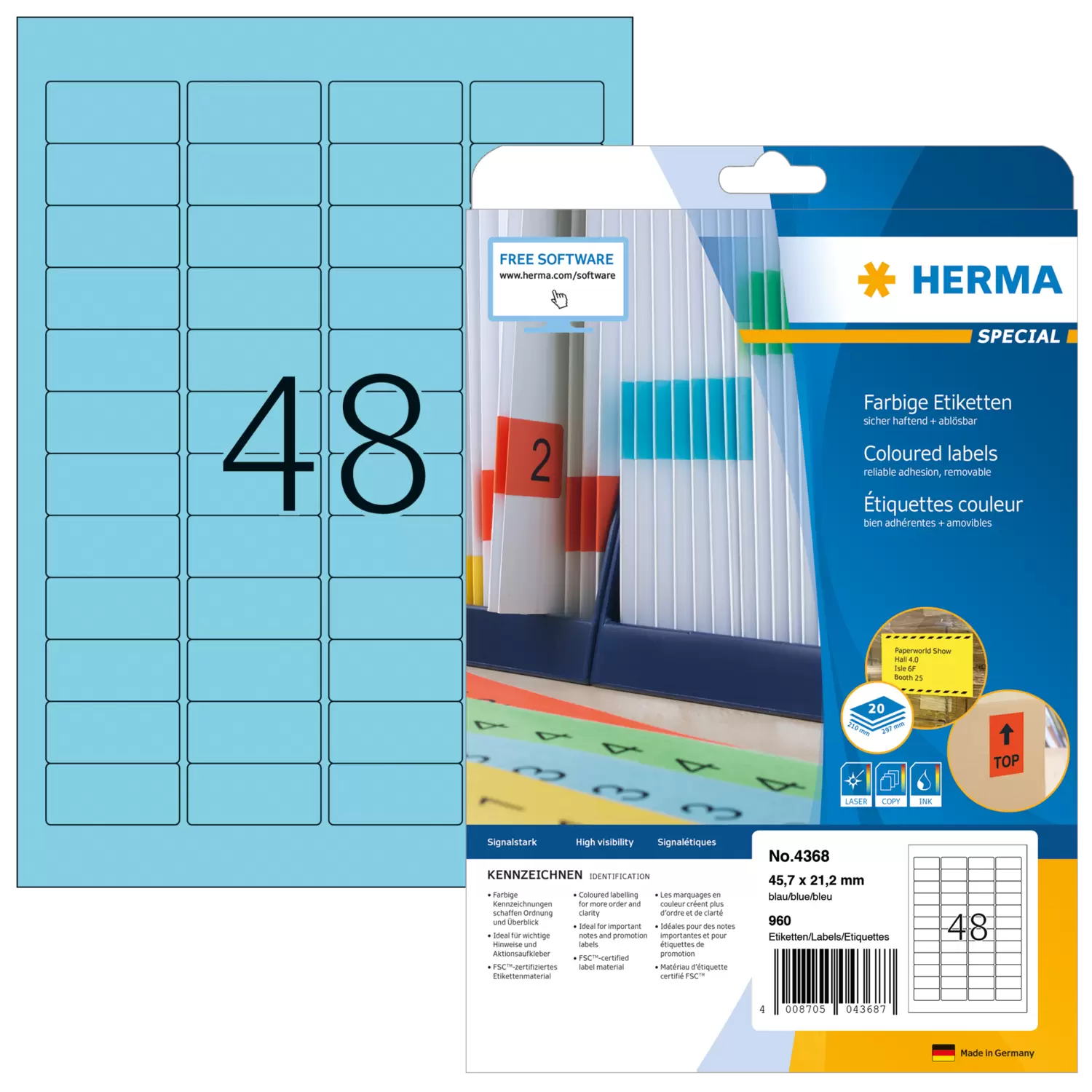 Farbige Etiketten auf A4-Blättern, selbstklebend. Ideal für Kennzeichnungen mit Signalcharakter, z. B. Warnhinweise, Eilvermerke, Adressänderungen, Farbcodierung, Aktionen,... Umweltfreundlich: FSC® Mix Credit-zertifiziertes Etikettenpapier, chlorfrei gebleicht, lösemittelfreier Haftkleber. Etiketten sind 100 % recyclingfähig mit dem Altpapier, Verpackung aus Recyclingkarton. Sehr gute Druckergebnisse auf allen Laser- und Inkjetdruckern, Kopierern, Farblaserdruckern und Farbkopierern. Störungsfreie Verarbeitung durch Rundum-Sicherheitskante und optimale Planlage. Kostenlose Softwarelösungen: www.herma.de/software.