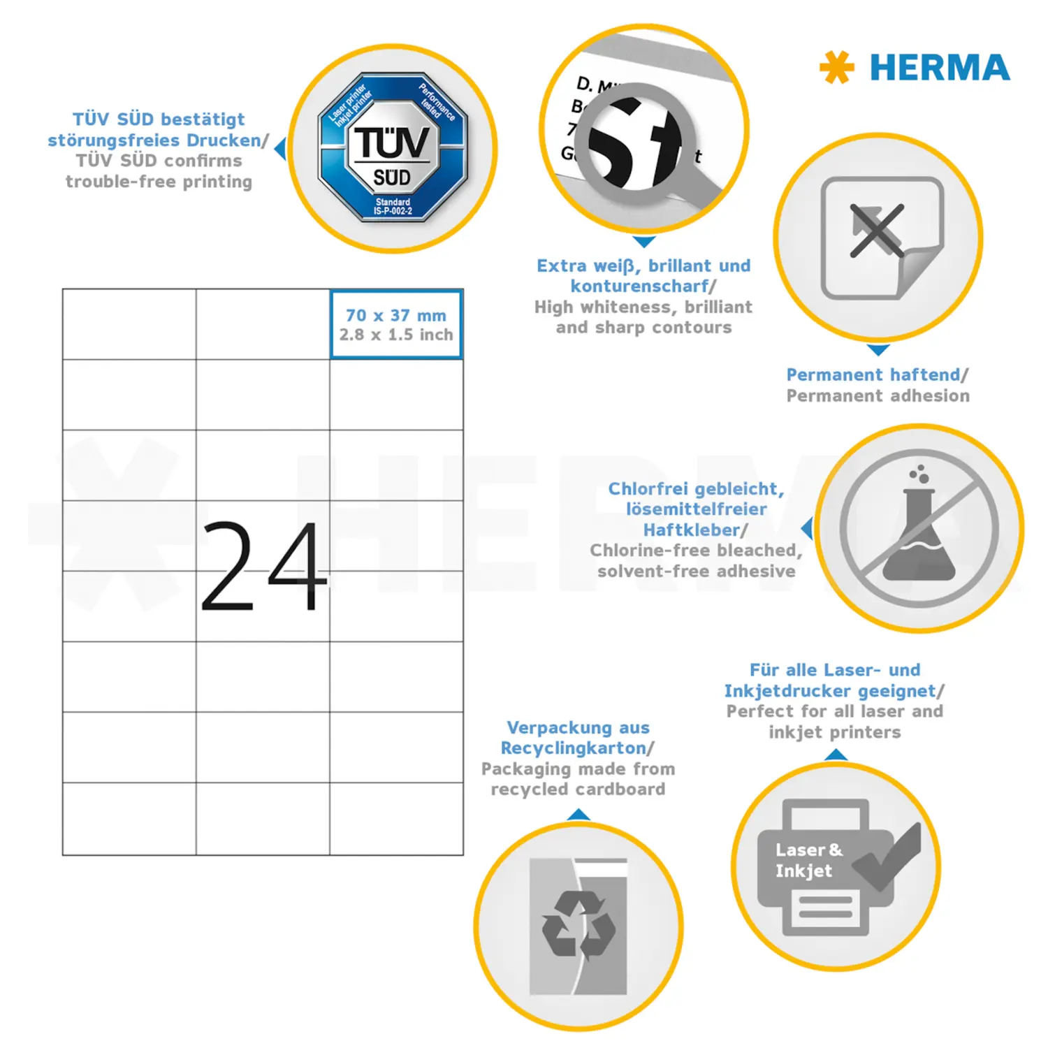 Farbige Etiketten auf A4-Blättern, selbstklebend. Ideal für Kennzeichnungen mit Signalcharakter, z. B. Warnhinweise, Eilvermerke, Adressänderungen, Farbcodierung, Aktionen,... Umweltfreundlich: FSC® Mix Credit-zertifiziertes Etikettenpapier, chlorfrei gebleicht, lösemittelfreier Haftkleber. Etiketten sind 100 % recyclingfähig mit dem Altpapier, Verpackung aus Recyclingkarton. Sehr gute Druckergebnisse auf allen Laser- und Inkjetdruckern, Kopierern, Farblaserdruckern und Farbkopierern. Störungsfreie Verarbeitung durch Rundum-Sicherheitskante und optimale Planlage. Kostenlose Softwarelösungen: www.herma.de/software.