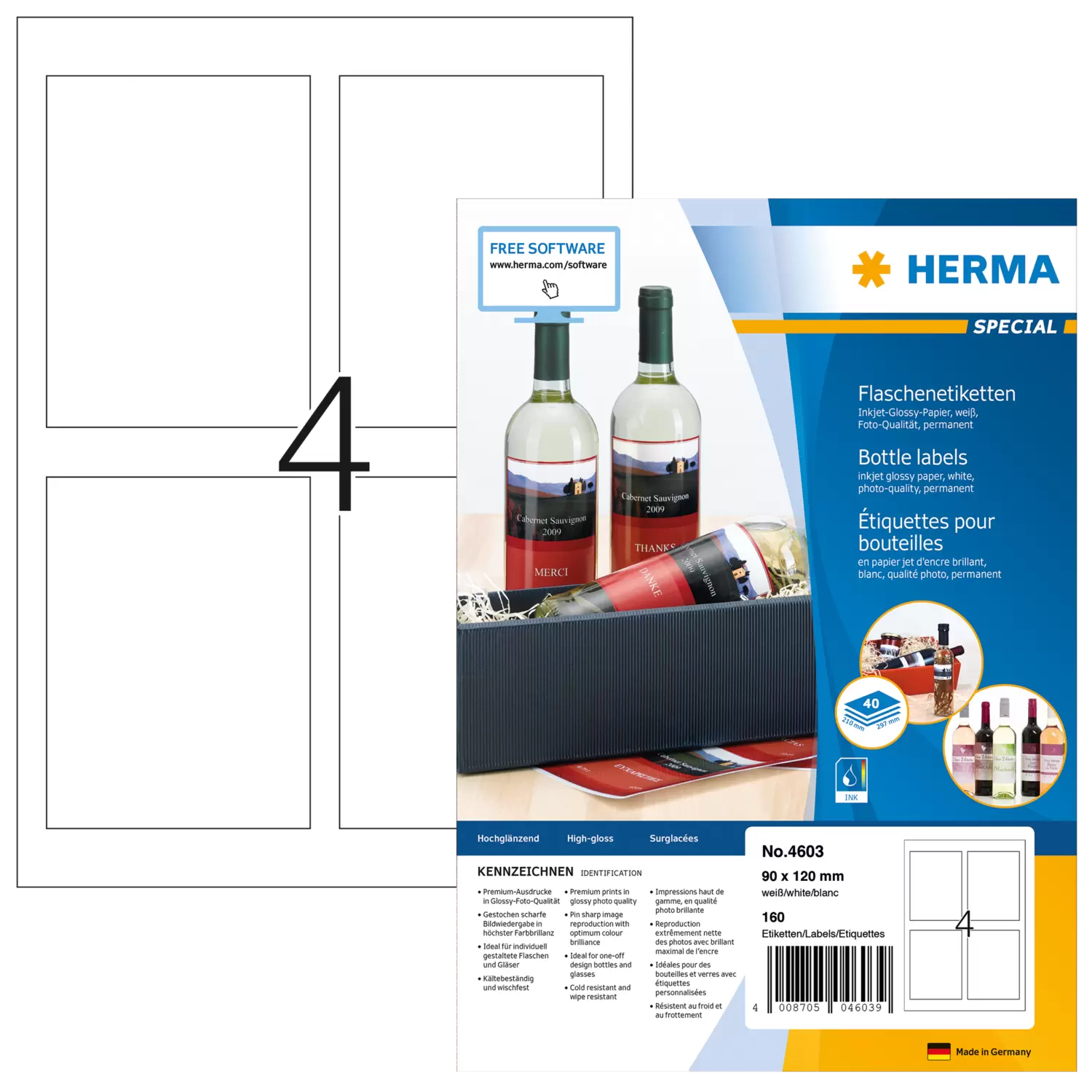 Flaschenetiketten, Inkjet, A4, 90 x 120 mm, aus Glossy-Papier, weiß, permanent haftend