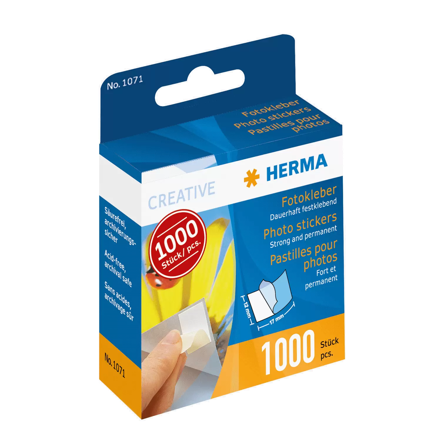 Schnell, sauber und festhaftend! HERMA Fotokleber, das sind beidseitig selbstklebende, permanent haftende Papierstücke, ideal zum dauerhaften Ein- und Aufkleben von Fotos, Postkarten und vielem mehr. Eine Seite ist direkt klebefertig, die ander Seite mit Schutzpapier abgedeckt. Zum schnellen und einfachen Abziehen gibt es die praktische Abziehlasche. Die Klebestücke sind 12 x 17 mm groß und lassen sich dank des praktischen Kartonspenders einzeln entnehmen und individuell positionieren. Der Klebestoff ist lösemittel- und säurefrei, fotoverträglich und archivierungsbestänig. Ideal zum klassischen Einkleben von Fotografien und Bildern, aber auch zum Basteln, zum Erstellen von Collagen, fürs Scrapbooking und für Dekorationen. Eine Packung enthält 1.000 Klebestücke aus Papier.