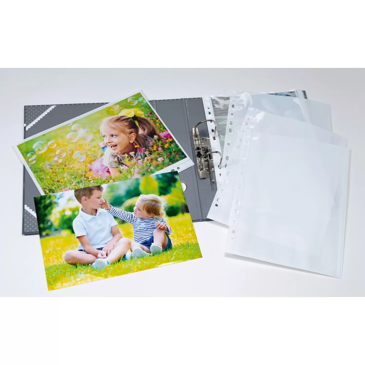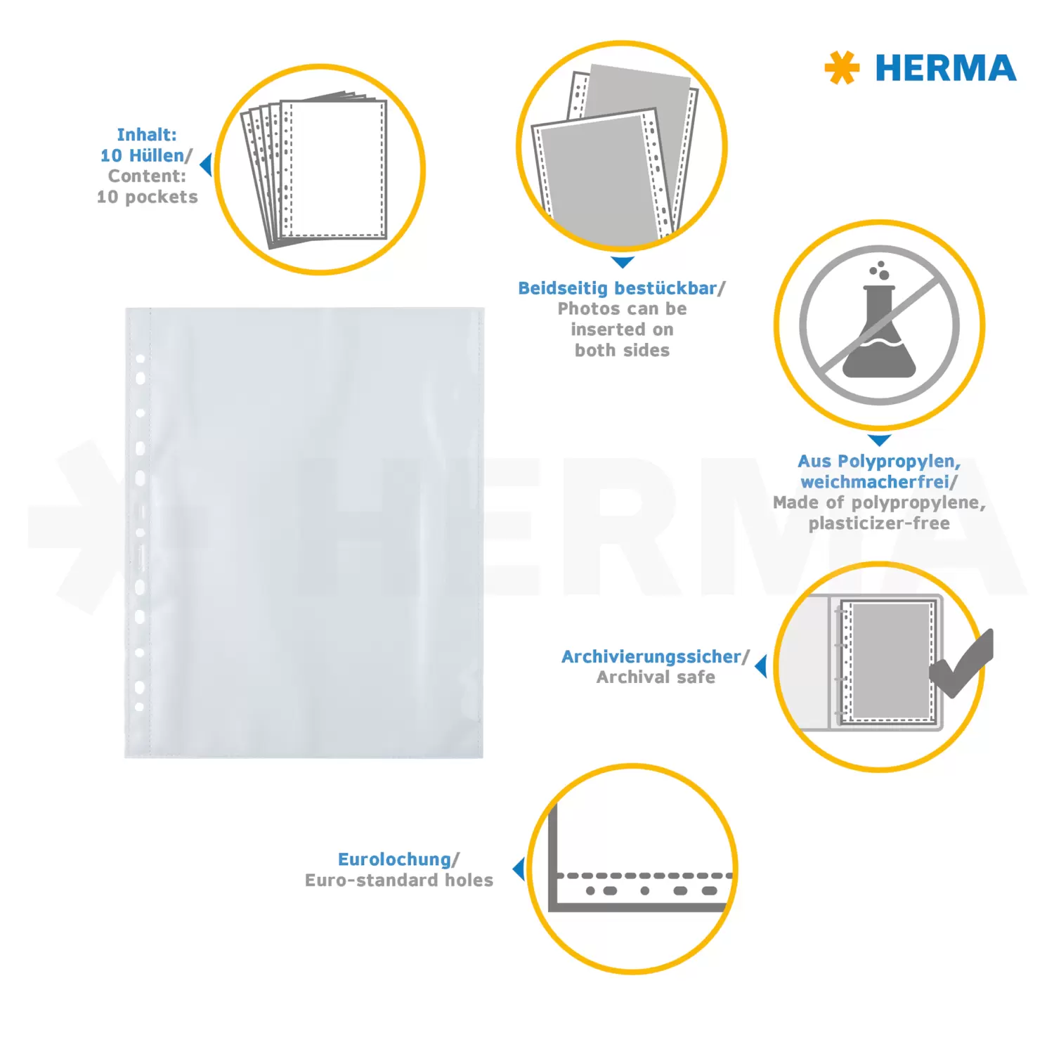 Die HERMA Fotosichthüllen Fotophan sind die praktischen Ordnungs- und Archivierungshelfer für Fotos, Bilder, Postkarten, Eintrittskarten und vieles mehr. Einfach in die Klarsichttaschen schieben und schon ist Alles sicher verstaut - unkompliziert und ganz ohne Kleben! Die Fotosichthüllen bestehen aus robustem weißem Polypropylen, mit beidseitig aufgeschweißten klar-transparenten Einstecktaschen für Fotos im Format bis zu 20 x 30 cm. So lassen sich 2 Fotos pro Hülle sicher und geschützt aufbewahren. Die Hüllen sind absolut weichmacherfrei und archivierungssicher, ohne chemische Einflüsse auf die Bilder. Pro Packung sind 10 Hüllen mit Platz für 20 Fotos enthalten. Durch die praktische Eurolochung lassen sie sich in alle gängigen Ordner, Alben und Ringbücher für DIN A4 Formate einheften. Ideal sind die HERMA Fotobooks, die in 5 tollen Farben erhältlich sind. Perfekter Schutz, ganz ohne Schmutz, Knicke oder Fingerabdrücke.