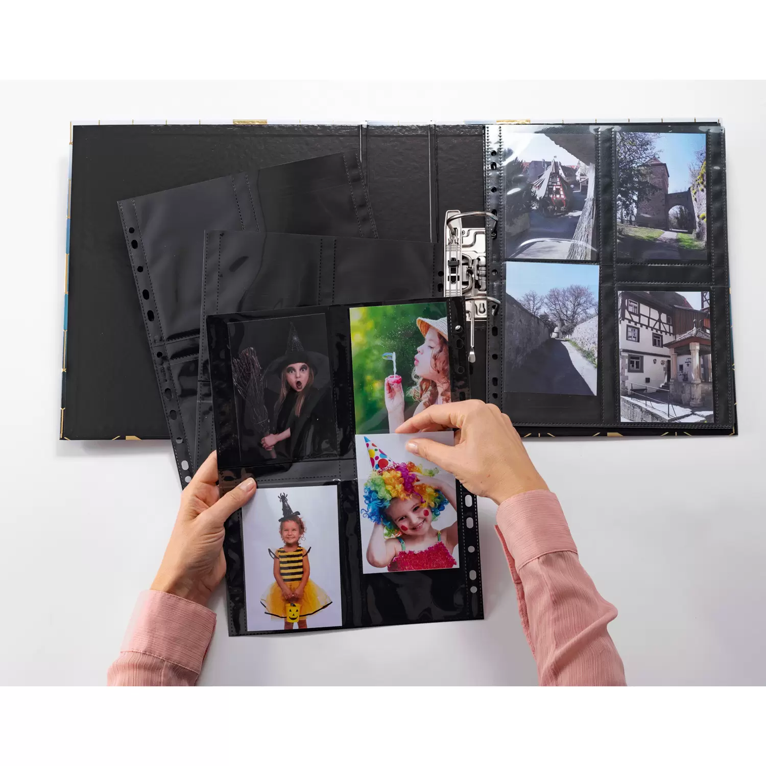Die HERMA Fotosichthüllen Fotophan sind die praktischen Ordnungs- und Archivierungshelfer für Fotos, Bilder, Postkarten, Eintrittskarten und vieles mehr. Einfach in die Klarsichttaschen schieben und schon ist Alles sicher verstaut - unkompliziert und ganz ohne Kleben! Die Fotosichthüllen bestehen aus robustem schwarzem Polypropylen, mit beidseitig aufgeschweißten klar-transparenten Einstecktaschen für Fotos im Format bis zu 9 x 13 cm hochkant. So lassen sich 8 Fotos pro Hülle sicher und geschützt aufbewahren. Die Hüllen sind absolut weichmacherfrei und archivierungssicher, ohne chemische Einflüsse auf die Bilder. Pro Packung sind 10 Hüllen mit Platz für 80 Fotos enthalten. Durch die praktische Eurolochung lassen sie sich in alle gängigen Ordner, Alben und Ringbücher für DIN A4 Formate einheften. Ideal sind die HERMA Fotobooks, die in 5 tollen Farben erhältlich sind. Perfekter Schutz, ganz ohne Schmutz, Knicke oder Fingerabdrücke.