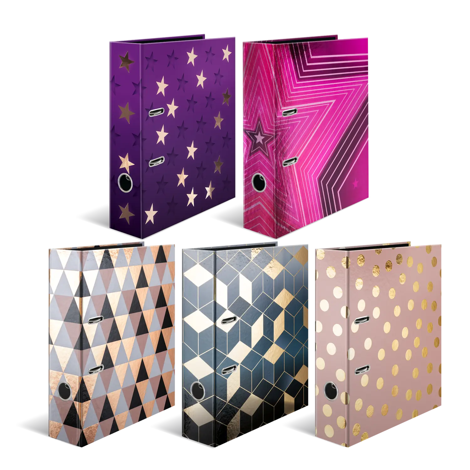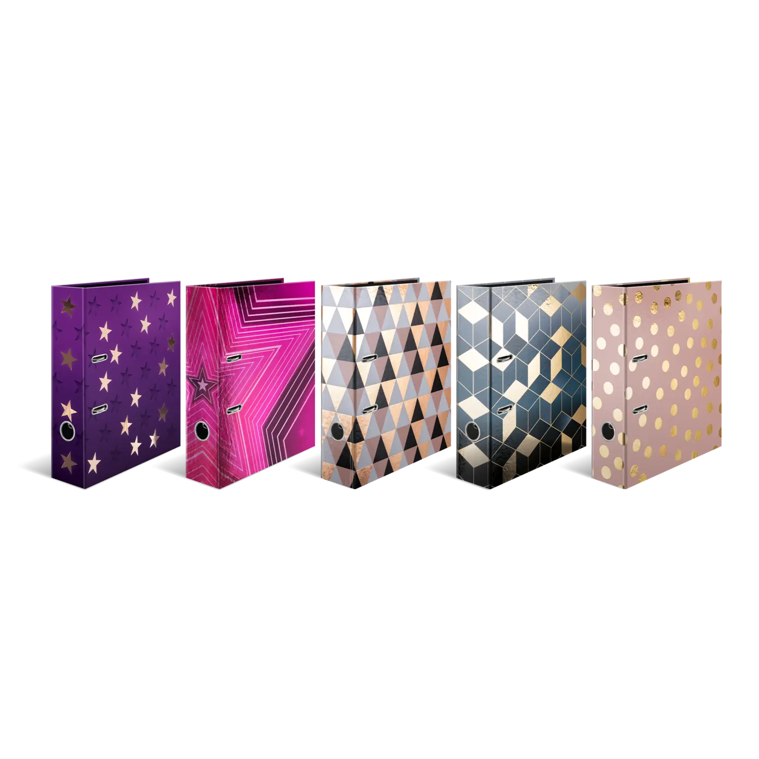 Wenn Ihnen Funktionalität genauso wichtig ist wie originelles Design, ist dieser moderne Motivordner in der Größe DIN A4 mit folienveredelten Punkten in Gold bestens geeignet, um Ordnung und Struktur in Ihren Arbeitsalltag zu bringen. Der Karton, aus dem der Motivordner angefertigt ist, ist umweltfreundlich und schützt den Inhalt optimal vor Außeneinflüssen. Ob in der Schule, Uni oder im Büro, als praktischer Helfer bringt der Ordner Stuktur und eine effiziente Arbeitsweise in den Alltag. Neben den schlichten, aber eleganten Punkten auf einem Hintergrund in wunderschönem Altrosa, kommen die Folienveredelungen noch besser zur Geltung. Der Ordner mit Motiv und Innendruck ist für sämtliche Zettel im DIN A4 Format aus der Schule, Uni oder dem Büro geeignet und kann auch für wichtige Dokumente im Alltag die optimale Lösung sein. Durch die integrierte Hebelmechanik lassen sich die Ringe des stabilen Ordners einfach öffnen bzw. schließen und garantieren ein leichtes Ein- und Ausheften. Papiere einzuordnen oder umzuheften ist dadurch total einfach. Der Niederhalter aus Metall hält das Ganze praktisch und zuverlässig beisammen. Am Rücken des 70 mm breiten Ordners aus Karton befindet sich ein praktisches Griffloch, durch das der Ordner einfach aus dem Regal geholt oder wieder hineingeschoben werden kann. Ergänzend bietet HERMA auch eine Ordnungsmappe an, die im gleichen Design gestaltet ist. Bereiten Sie Ihrem Papier-Chaos ein Ende, mit diesem modernen Ordner von HERMA.