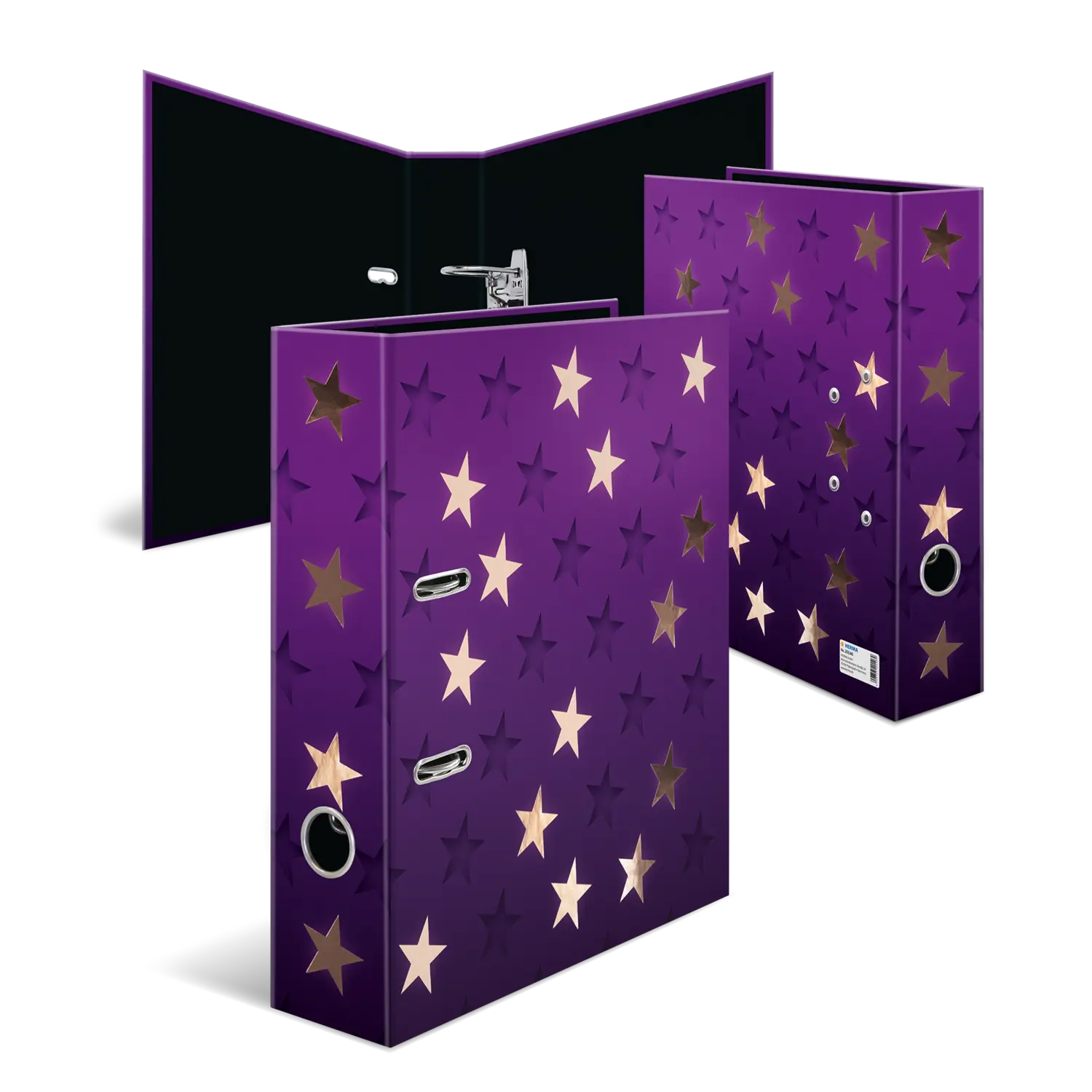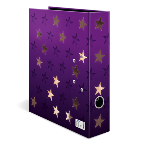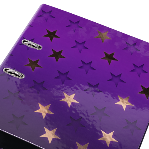 Der Motiv Ordner Stars ist etwas ganz Besonderes, denn er vereint Design und Funktonalität auf höchstem Niveau. Das tief dunkelviolette Design bringt in Kombination mit der glänzend schimmernden Roségold Foli enveredelungen die Sterne des Motivs wie am Nachthimmel zum Strahlen. Der stylische Tiefeneffekt versetzt dem Ordner außerdem einen zusätzlichen Hingucker und sorgt dafür, dass die Sterne beinahe wie gestanzt aussehen. Ein Highlight und Hingucker! Der Ordner ist aus hochwertigem Karton hergestellt, mit Roségoldfolie veredelt und durch das praktische Griffloch ganz einfach hervorzuholen und wieder zurückzustellen. Die spezielle Hebelmechanik mit Niederhalter aus Metall sorgt dafür, den Ordnerinhalt ordentlich und stabil beisammen zu halten. Der breite Rücken garantiert Stabilität im Regal und ausreichend Platz für viele Unterlagen im Format bis DIN A4.