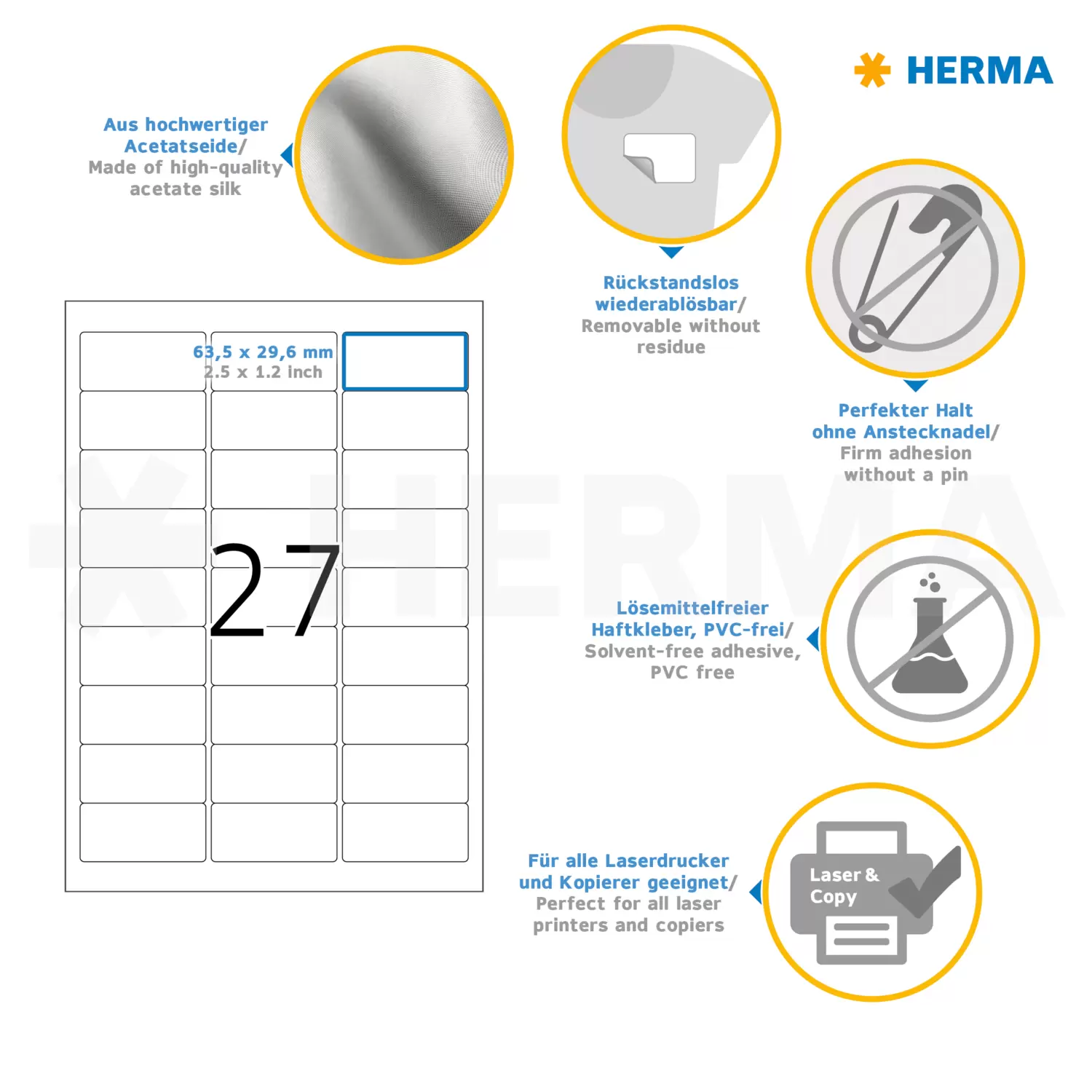 Namensetiketten, ablösbar, A4, 63,5 x 29,6 mm, weiß, aus Acetatseide, bedruckbar
