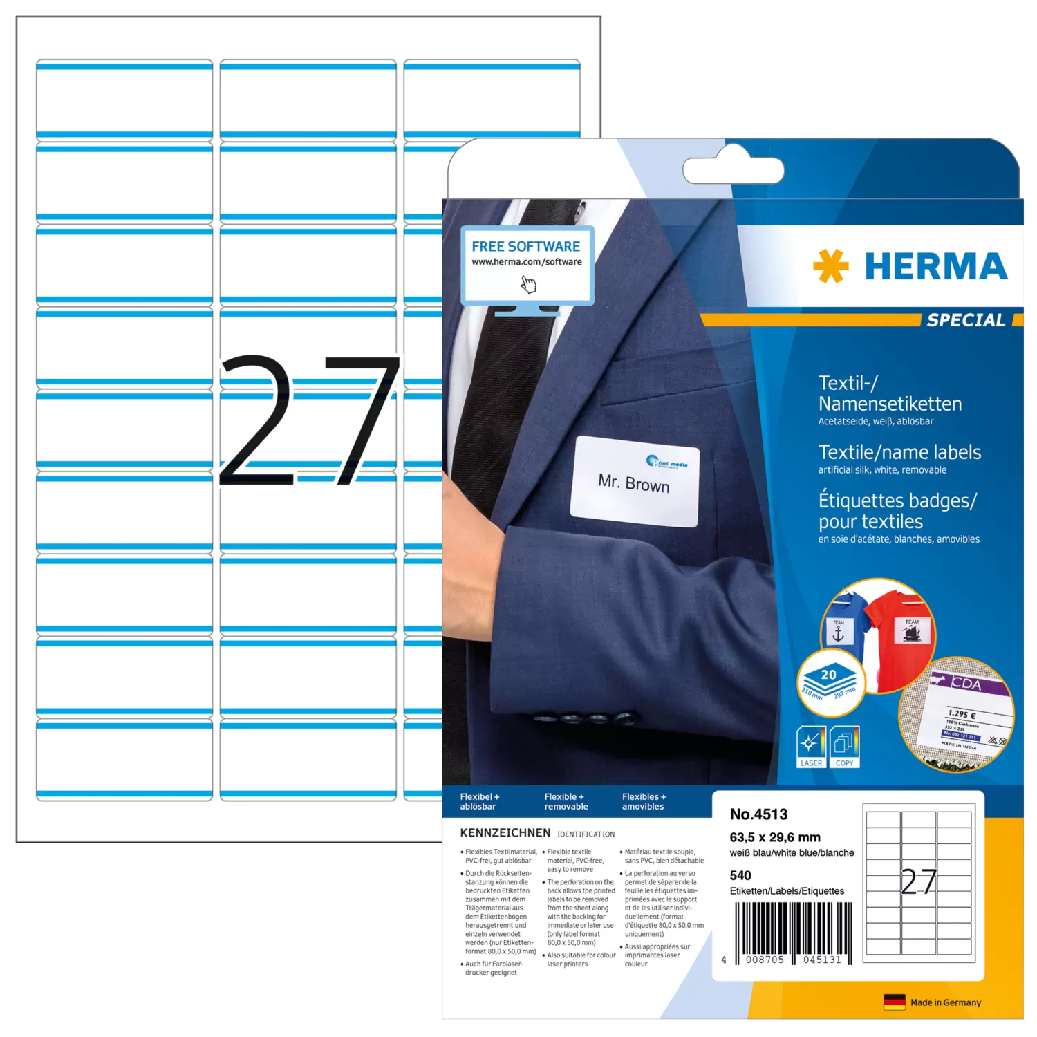 Etiketten aus Acetatseide, auf A4-Blättern, selbstklebend. Ideal geeignet für Seminare, Konferenzen, Messen, oder zur Kennzeichnung von Stoffen, Teppichen und Matratzen. Praktische Alternative zu Plastik schildern: schnell beschriftet, perfekter Halt ohne Anstecknadel. Flexibles Textilmaterial, sicher haftend, gut ablösbar. Achtung: nicht auf Feinleder oder feine Textilien, z. B. Seide, Samt oder Cord kleben. Für Laserdrucker, Kopierer, Farblaserdrucker und Farbkopierer. Nicht für Inkjetdrucker geeignet. Kostenlose Softwarelösungen: www.herma.de/software.