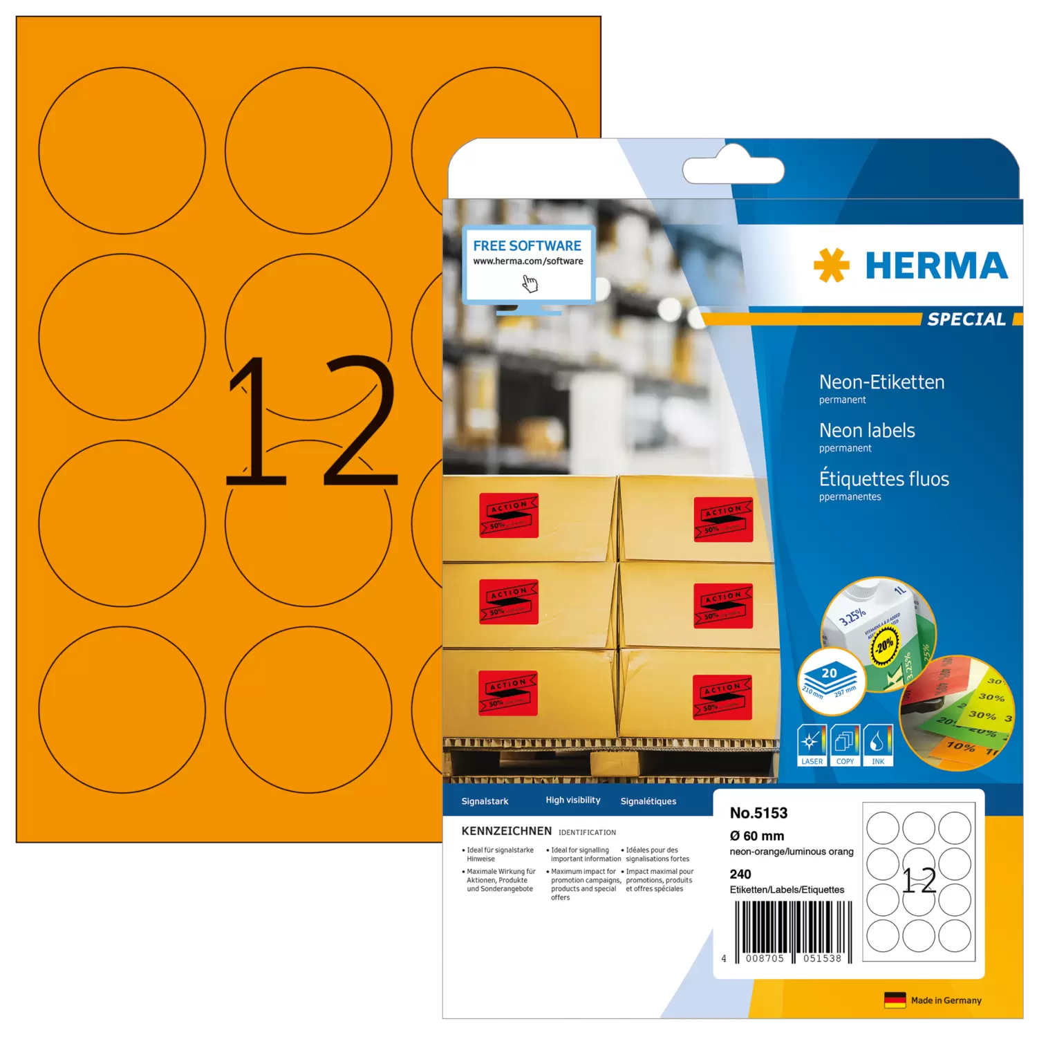 Etiketten in Neonfarben für Informationen mit Signalwirkung, auf A4-Blättern, selbstklebend. Auffallend und informativ: ideal für Kennzeichnungen mit Signalcharakter, z. B. Warnhinweise, Eilvermerke, Aktionen, Farbcodierungen,... In 4 signalstarken Neonfarben, FSC® Mix Credit-zertifiziert. Für Laser- und Inkjetdrucker, Kopierer, Farblaserdrucker und Farbkopierer geeignet. Störungsfreie Verarbeitung durch Rundum-Sicherheitskante und optimale Planlage. Kostenlose Softwarelösungen: www.herma.de/software.