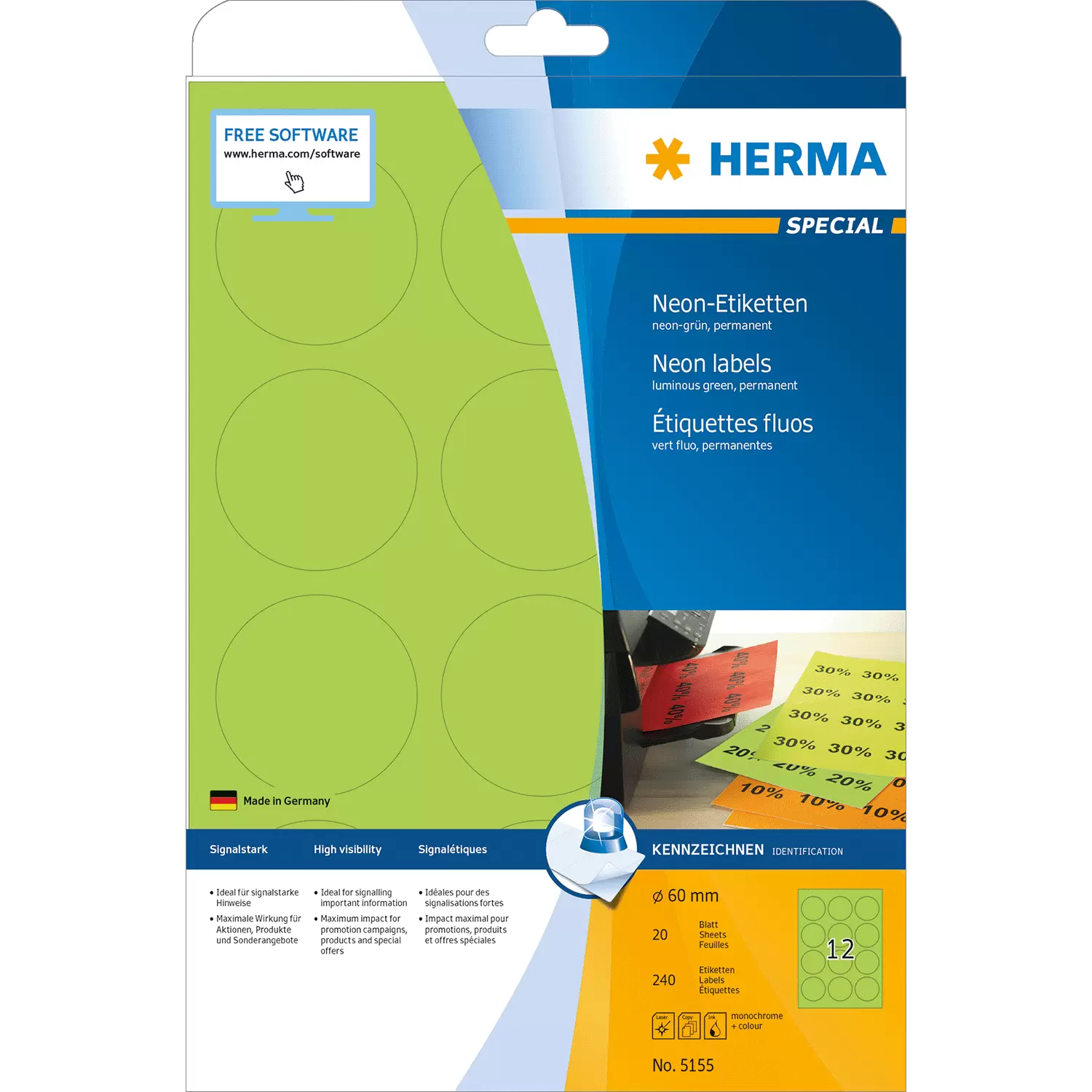 Neonetiketten A4, Ø 60 mm, rund, leuchtgrün, permanent haftend