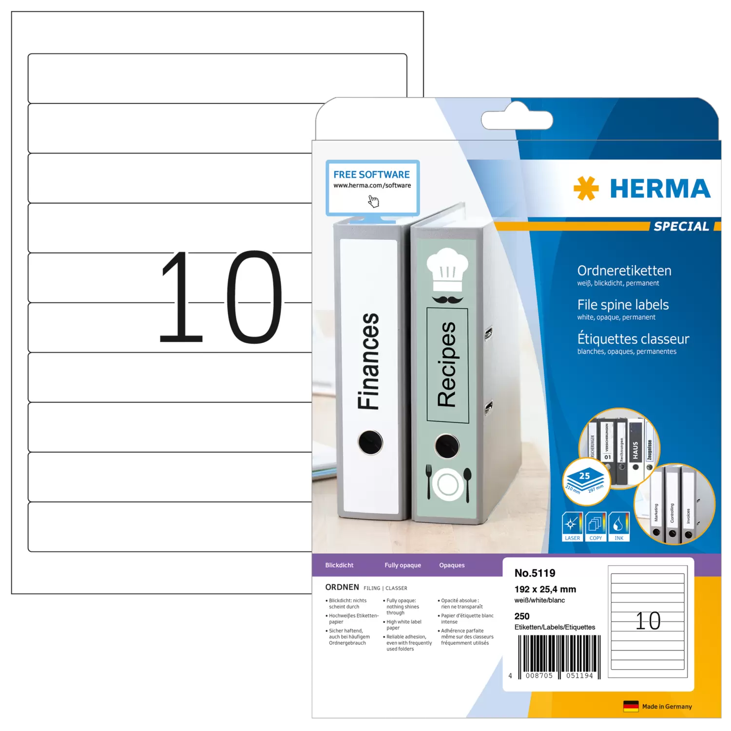 Ordneretiketten A4, 192 x 25,4 mm, weiß, blickdicht, permanent haftend, für schmale Ordner (kurz)