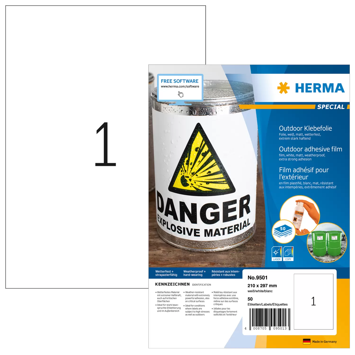 Wetterfeste Etiketten aus weißer, matter Polyethylen-Folie, selbstklebend. Ideal für Outdoor-Anwendungen und stark beanspruchte Etikettierungen: Eigentumsetiketten, Schaufensteraufkleber, Hinweis- und Warnschilder, Kennzeichnungen in Lager und Produktion. Extrem stark haftend, auch auf kritischen Oberflächen. Wetterfest, dehnfähig, alterungsbeständig, Öl und Schmutz abweisend, abwaschbar, temperaturbeständig von -40 bis +150 °C, seewasserbeständig. Für Laserdrucker, Kopierer, Farblaserdrucker und Farbkopierer. Kostenlose Softwarelösungen: www.herma.de/software.