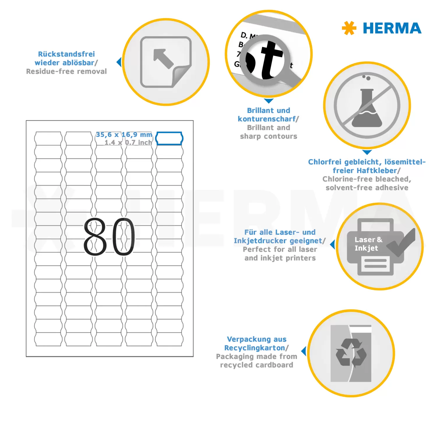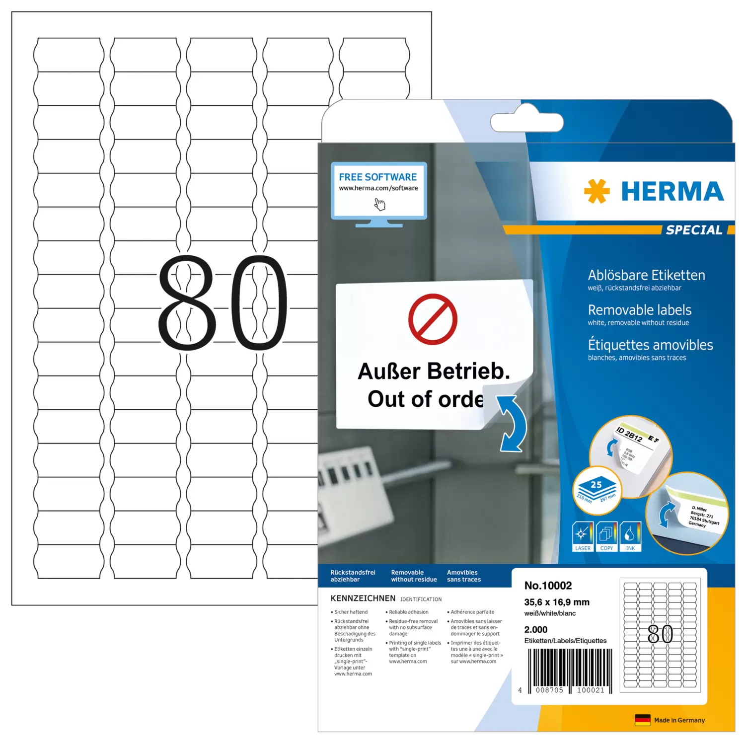 Selbstklebende Etiketten auf A4-Blättern. Sicher haftend auf allen glatten, trockenen, unbeschädigten und staubfreien Flächen. Rückstandsfrei wieder abziehbar, ohne den Untergrund zu beschädigen. Ideal für zeitlich befristete oder wechselnde Kennzeichnungen und Oberflächen, die nicht beschädigt werden sollen. Sehr gute Druckergebnisse auf allen Laser- und Inkjetdruckern, Kopierern, Farblaserdruckern und Farbkopierern. Störungsfreie Verarbeitung durch Rundum-Sicherheitskante und optimale Planlage. Umweltfreundlich: FSC® Mix Credit-zertifiziert, chlorfrei gebleicht, lösemittelfreier Haftkleber. Etiketten sind 100 % recyclingfähig mit dem Altpapier, Verpackung aus Recyclingkarton. Kostenlose Softwarelösungen: www.herma.de/software.
