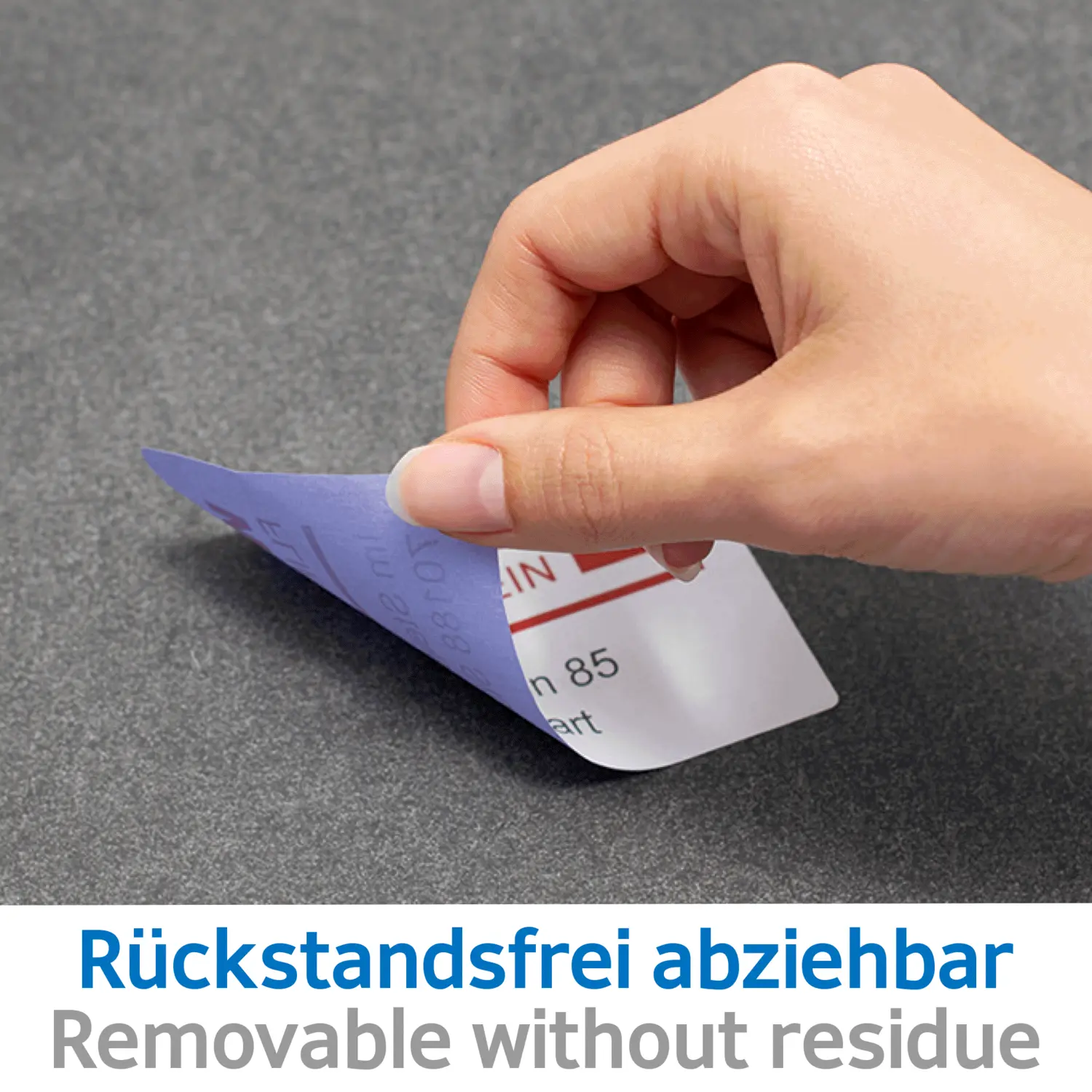 - Einfach ablösbar, ohne Klebstoffrückstände zu hinterlassen: ideal für zeitlich befristete oder wechselnde Kennzeichnungen