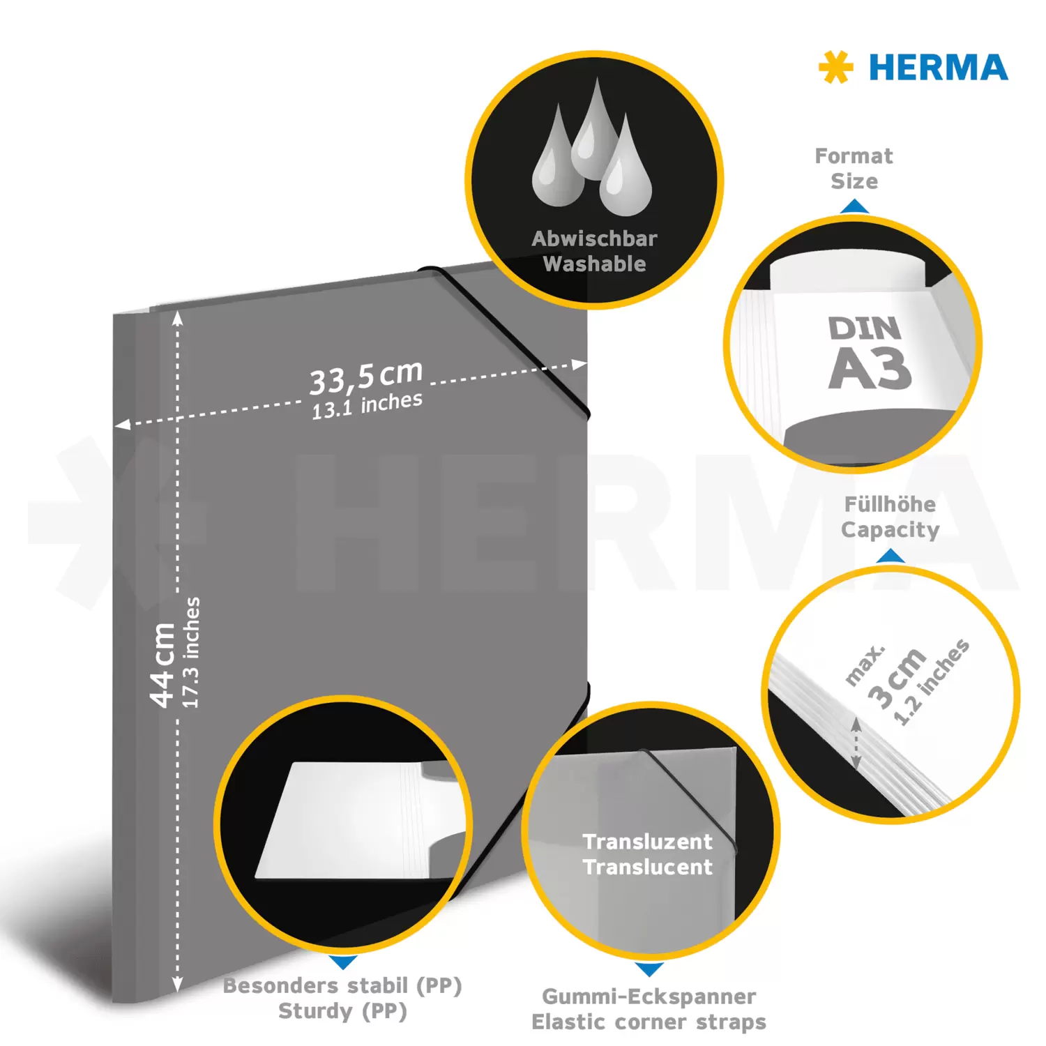 Zeitlose Sammelmappe in vielen durchscheinenden Farben mit Gummizug-Eckspannern vom Markenhersteller HERMA, mit 3 bedruckten Einschlaglaschen. Die HERMA Ordnungsmappen sind aus stabilem, robustem Polypropylen-Kunststoff, abwaschbar und strapazierfähig. Ideal zur Aufbewahrung von losem Schriftgut, Zeichnungen, Dokumenten, Bildern, Unterlagen, etc. in Kindergarten, Schule, zu Hause oder im Büro. Weitere tolle Designs der Zeichenmappen sind erhältlich in DIN A3 (297 x 420mm) oder DIN A4 (210 x 297mm), in Karton oder Kunststoff, uni oder bedruckt, für Klein und Groß, Kinder und Erwachsene, Schüler, Künstler und Bastler. Im gleichen Design wie die Mappen sind auch Ordner und Ringbücher von HERMA erhältlich.