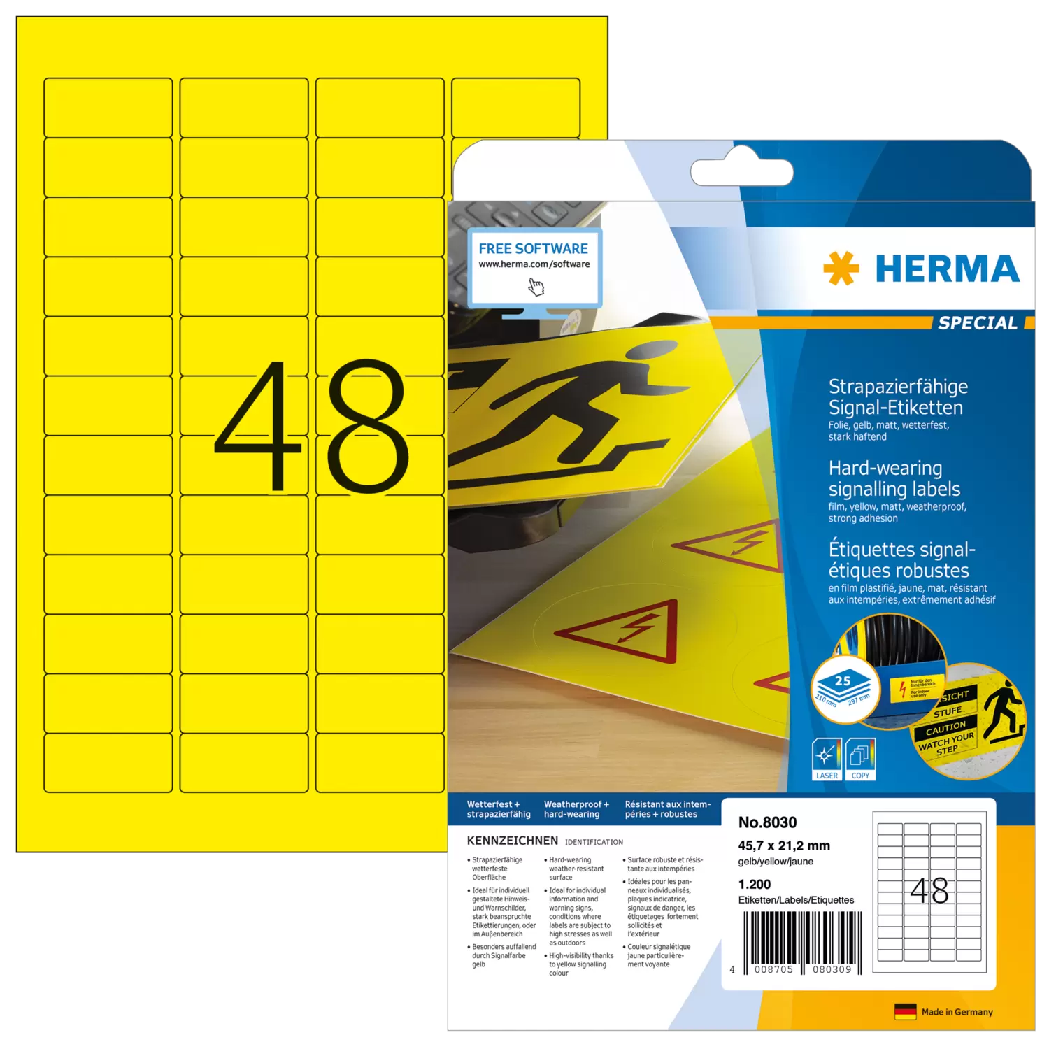 Gelbe Folien-Etiketten auf A4-Blättern, selbstklebend. Ideal für stark beanspruchte Etikettierungen und im Außenbereich: Eigentumsetiketten, Hinweis- und Warnschilder, Kennzeichnungen in Lager und Produktion. Besonders auffallend durch Signalfarbe gelb. Strapazierfähige wetterfeste Oberfläche, besonders stark haftend, UV- und alterungsbeständig, Öl und Schmutz abweisend, abwaschbar, temperaturbeständig von -30 bis +80 °C, seewasserfest. Störungsfreie Verarbeitung durch Rundum-Sicherheitskante und optimale Planlage. Für Laserdrucker und Kopierer, Farblaserdrucker und Farbkopierer. Nicht für Inkjetdrucker geeignet. Kostenlose Softwarelösungen: www.herma.de/software.