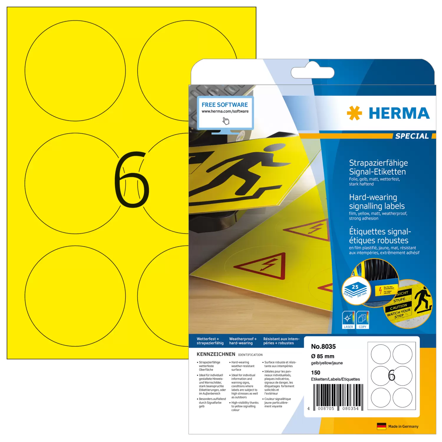 Gelbe Folien-Etiketten auf A4-Blättern, selbstklebend. Ideal für stark beanspruchte Etikettierungen und im Außenbereich: Eigentumsetiketten, Hinweis- und Warnschilder, Kennzeichnungen in Lager und Produktion. Besonders auffallend durch Signalfarbe gelb. Strapazierfähige wetterfeste Oberfläche, besonders stark haftend, UV- und alterungsbeständig, Öl und Schmutz abweisend, abwaschbar, temperaturbeständig von -30 bis +80 °C, seewasserfest. Störungsfreie Verarbeitung durch Rundum-Sicherheitskante und optimale Planlage. Für Laserdrucker und Kopierer, Farblaserdrucker und Farbkopierer. Nicht für Inkjetdrucker geeignet. Kostenlose Softwarelösungen: www.herma.de/software.