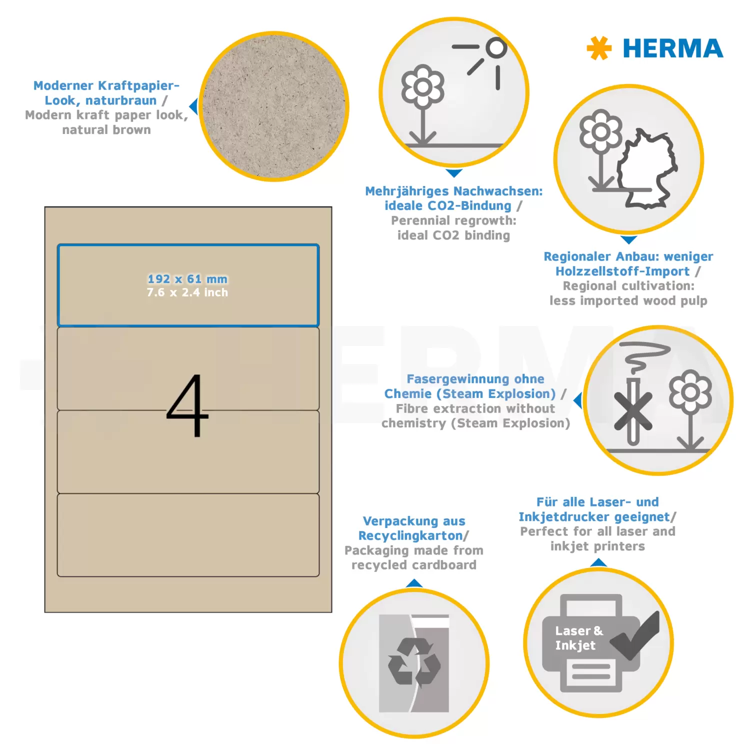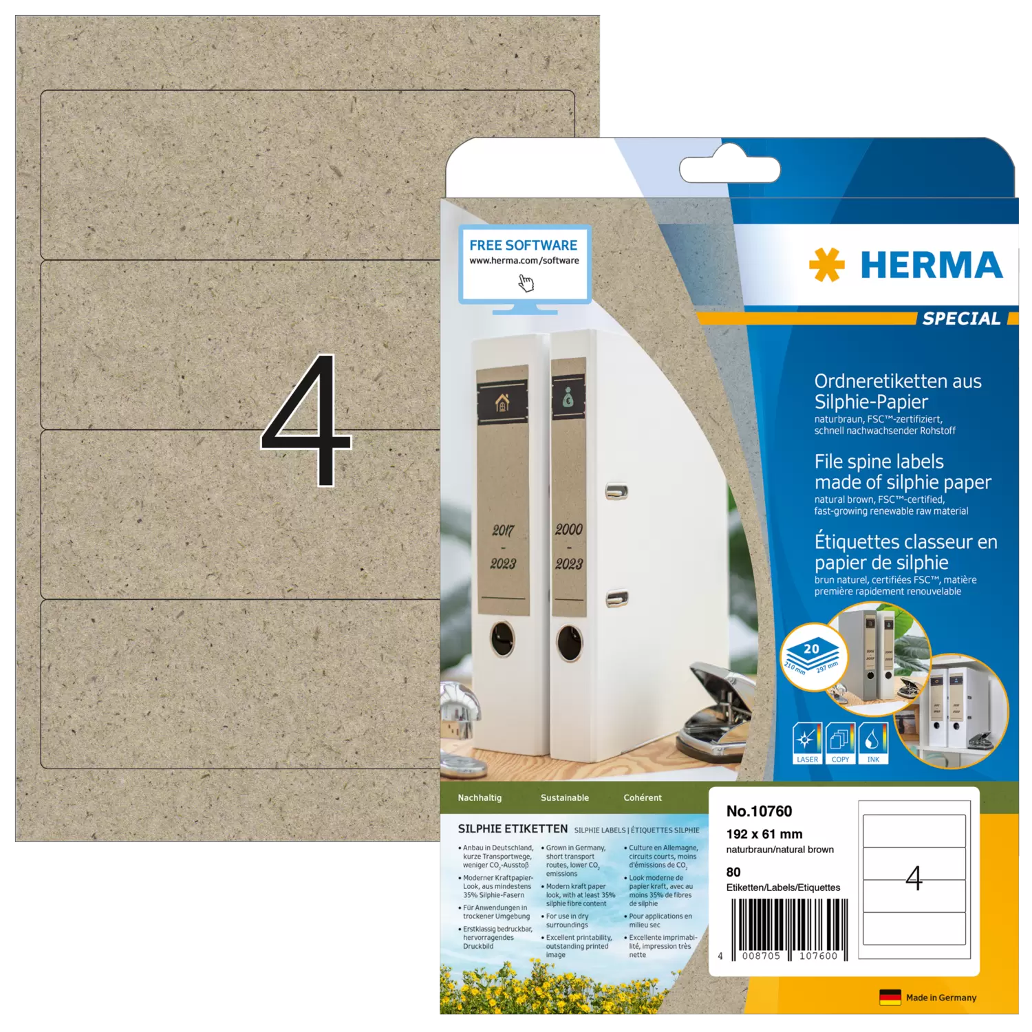 Das besondere Papier aus der Königin der ökologischen Nutzpflanzen - der Donau Silphie. Lebensraum für Bienen, zur Energiegewinnung, ideale CO2 Bindung und ein Mehrwert für das Ökosystem. Ein Beitrag zur Nachhaltigkeit. FSC® Mix Credit-zertifiziert. Anbau in Deutschland, kurze Transportwege, weniger CO2-Ausstoß. Moderner Kraftpapier-Look, aus mindestens 35% Silphie-Fasern. (Schwankungen im Farbton möglich, da umweltfreundlicher Rohstoff). Für direkten Lebensmittelkontakt geeignet. Etikettenpapier recyclebar mit dem Altpapier. Vom Etikett bis zur Verkaufsverpackung: rundum nachhaltig. Sehr gute Druckergebnisse auf allen Laser- und Inkjetdruckern, Kopierern, Farblaserdruckern und Farbkopierern. Kostenlose Softwarelösungen: www.herma.de/buero-zuhause/vorlagen-software.