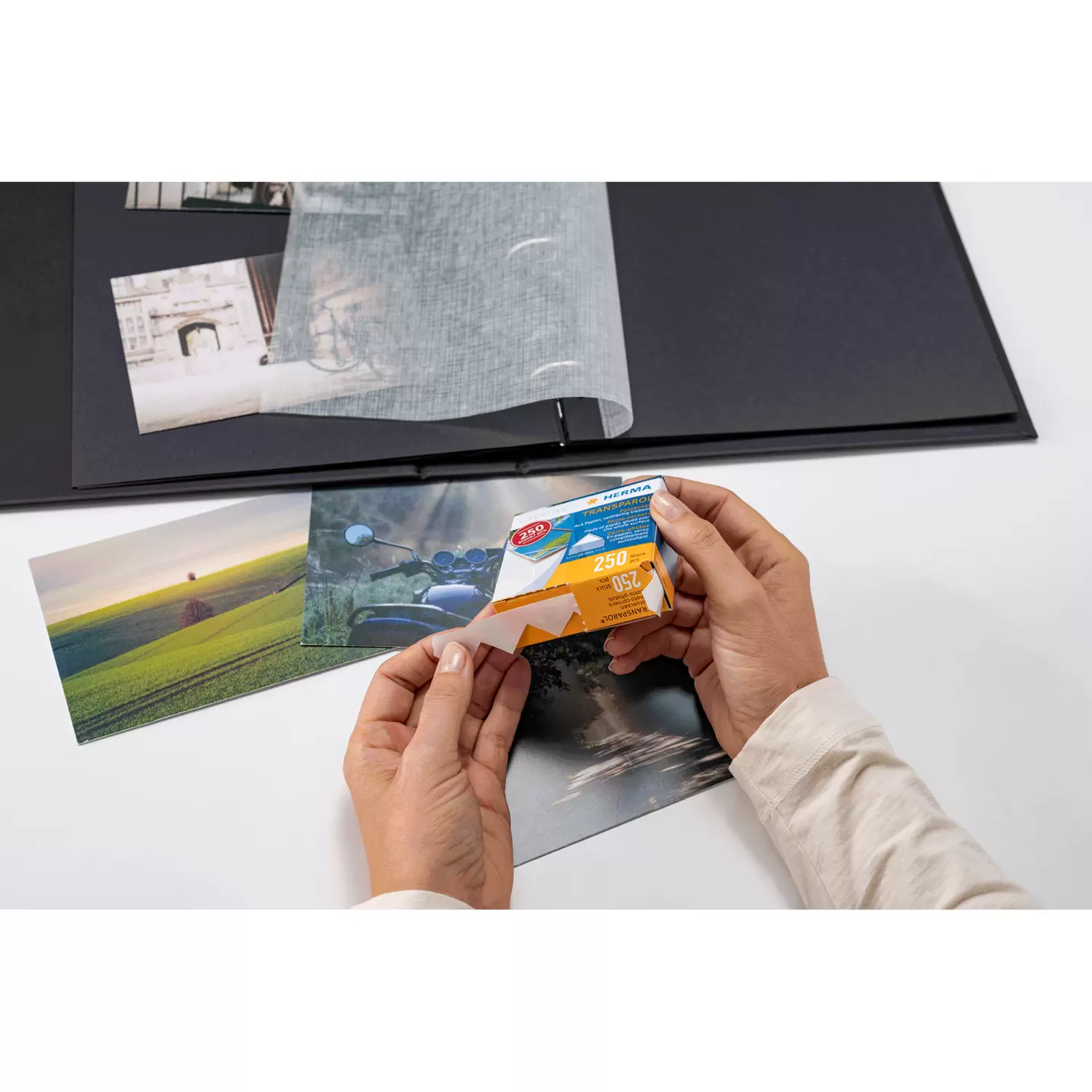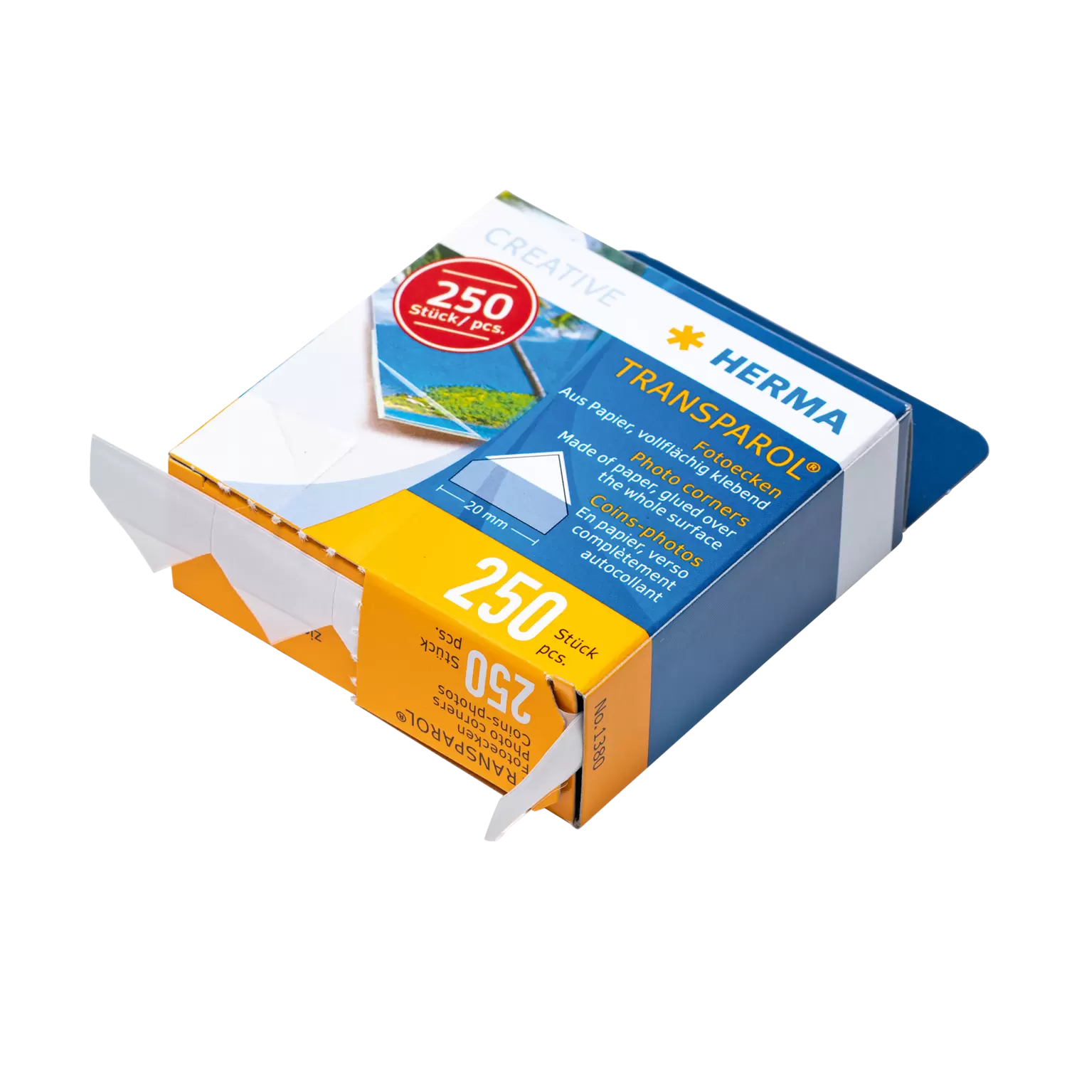 Elegant, praktisch und schön! HERMA Fotoecken sind die Einklebe-Klassiker und beim Befüllen von Foto- und Sammelalben nicht mehr wegzudenken. Nützlich, praktisch und einfach in der Anwendung. Das Beste daran: Fotos, Bilder und Briefmarken werden nicht selbst verklebt, sondern nur eingesteckt und können so beliebig oft ausgetauscht und neu arrangiert werden. Die Fotoecken sind selbstklebend und verdecken dank der Klarsichtfolioenecke Nichts von den Fotos oder Bildern. So bleiben auch Briefmarken vollständig sichtbar – ideal für Sammler. Der praktische Kartonspender enthält 250 Stück, die alle einzeln entnehmbar sind. Die Kantenlänge der Fotoecken beträgt 20 mm. Der Klebestoff ist lösemittel- und säurefrei, fotoverträglich und archivierungsbestänig. Fotoecken von HERMA – die elegante Art des Archivierens!