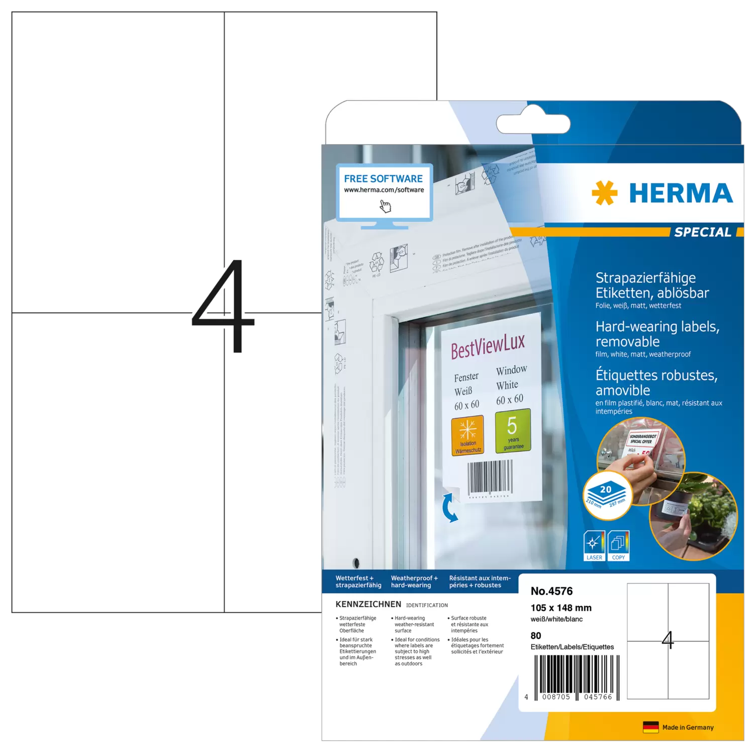Weiße matte Folien-Etiketten auf A4-Blättern, selbstklebend, wiederablösbar. Ideal für temporäre Auszeichnungen, stark beanspruchte Etikettierungen und im Außenbereich: für Produktauszeichnungen, als Eigentumsetiketten, Schaufensteraufkleber, Hinweis- und Warnschilder, für wechselnde Informationen in Lager und Produktion. Besonders stark haftend, dabei wiederablösbar ohne Kleberückstände zu hinterlassen. Strapazierfähige Oberfläche, wetterfest, alterungsbeständig, Öl und Schmutz abweisend, abwaschbar, temperaturbeständig von -40 bis +60 °C. Störungsfreie Verarbeitung durch Rundum-Sicherheitskante und optimale Planlage. Für Laserdrucker und Kopierer, Farblaserdrucker und Farbkopierer. Nicht für Inkjetdrucker geeignet. Kostenlose Softwarelösungen: www.herma.de/software.