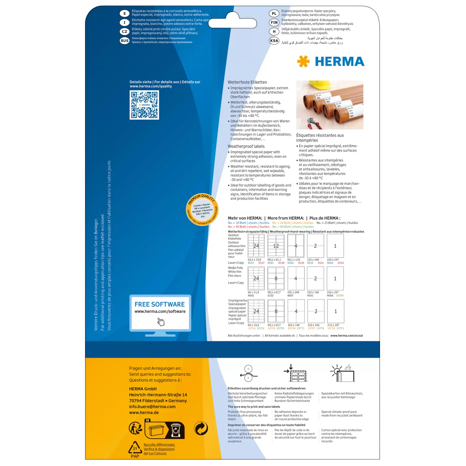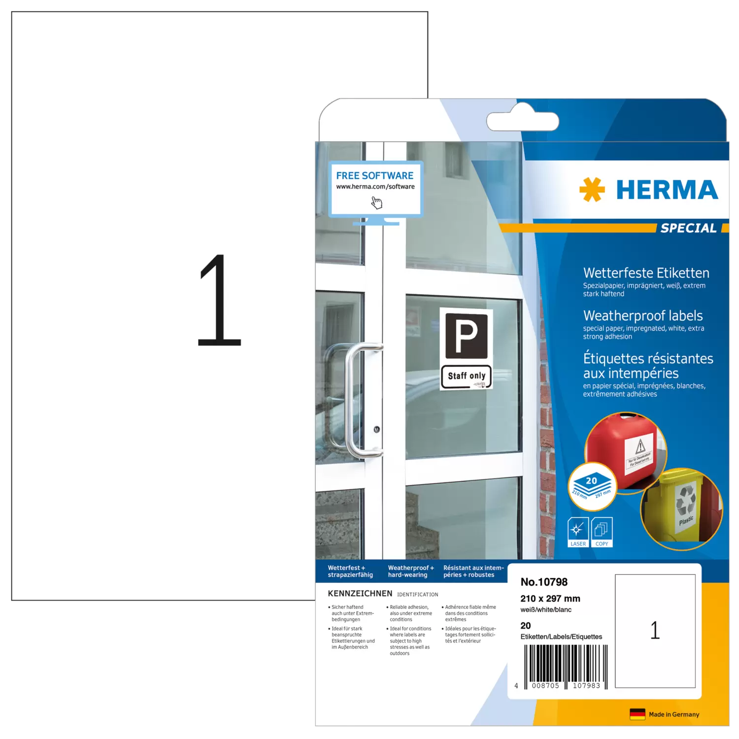 Etiketten aus witterungsbeständigem Spezialpapier, selbstklebend. Aus imprägniertem, weißem Spezialpapier, extrem stark haftend, auch auf kritischen Oberflächen. Ideal für stark beanspruchte Etikettierungen und im Außenbereich. Wasser-, Öl und Schmutz abweisend, alterungsbeständig, seewasserfest. Temperaturbeständig von -30 bis +80 °C. Trägermaterial aus chlorfrei gebleichtem Zellstoff, lösungsmittelfreier Haftkleber. Für Laserdrucker und Kopierer. Nicht für Inkjetdrucker, Farblaserdrucker und Farbkopierer geeignet. Kostenlose Softwarelösungen: www.herma.de/software.