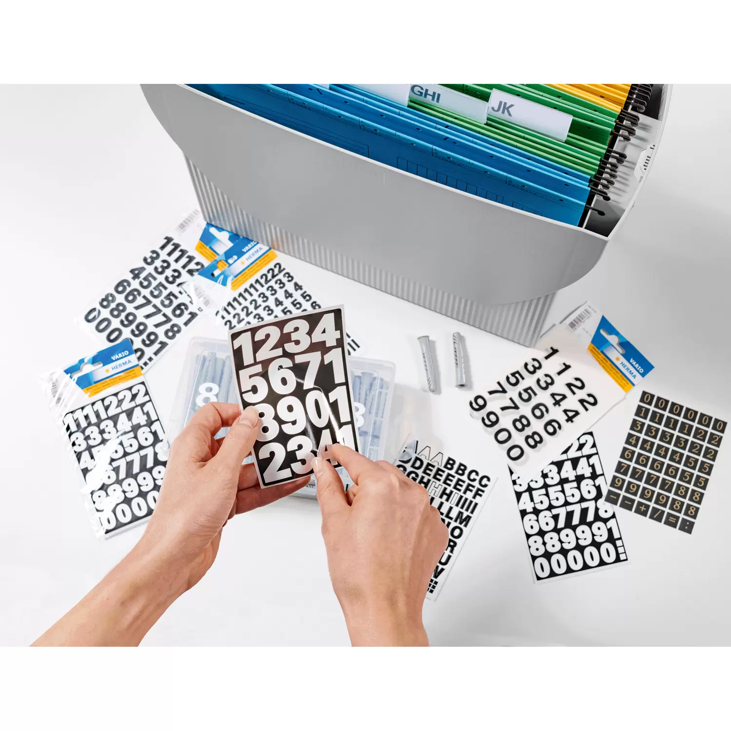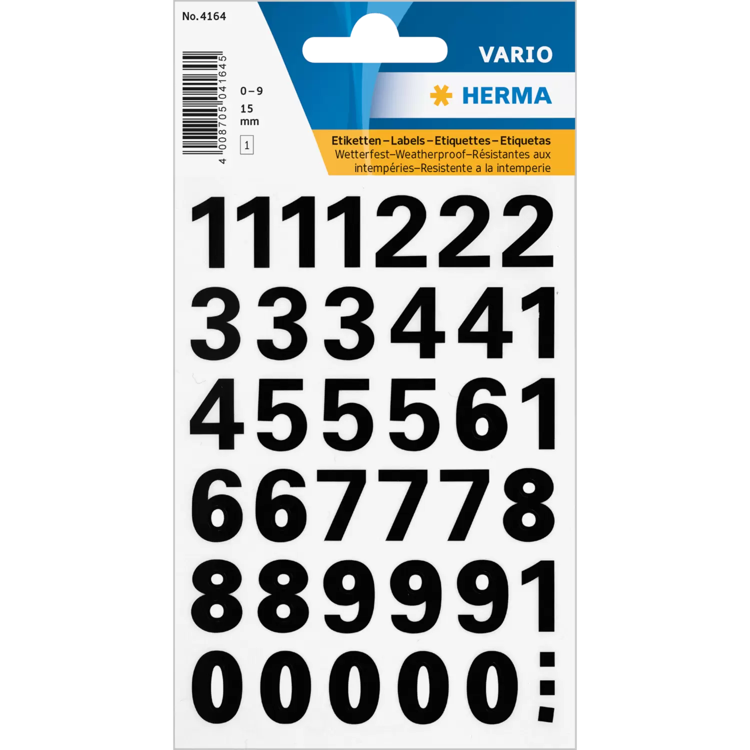 Die schwarzen Sticker mit Zahlen 0-9 von HERMA sind perfekt für individuelle Beschriftung, Markierung oder Kennzeichnung in unzähligen Anwendungsbereichen geeignet. Als vielseitige, aber einfach anzuwendende Alltagshelfer können sie dabei auf allen glatten Oberflächen aufgebracht werden. Egal ob auf Aufbewahrungsboxen im Büro oder Zuhause, auf Elektrogeräten zur Inventur oder auf Klingeln und Briefkästen: Die selbstklebenden, permanent haftenden und wetterfesten Zahlenaufkleber halten überall zuverlässig. Auch im beruflichen Bereich können HERMA Zahlen-Sticker oft zum Einsatz kommen, etwa zur Organisation im Büro, bei der Archivierung oder zur Kennzeichnung von Unterlagen. Die 15 mm hohen Zahlen sind auf hochwertiger matter Folie gedruckt und überzeugen bei allen Anwendungen im Innen- und Außenbereich durch die bewährte HERMA-Qualität. In jeder Packung befinden sich insgesamt 39 Sticker. Die Zahlen von 0 bis 9 sind in mehrfacher Ausführung vorhanden.